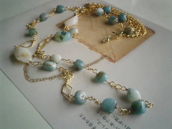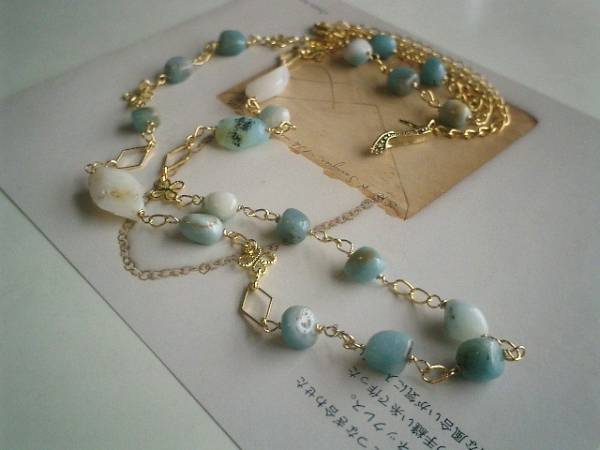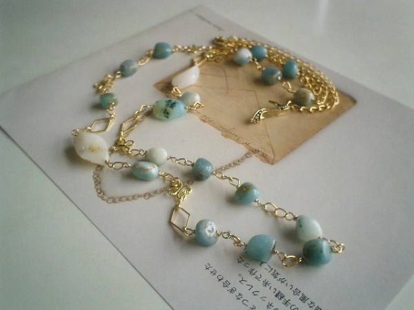 ロマンチックを集めて・・シリーズです♪6月の水色・・儚げなアマゾナイトのネックレスです♪シックな水色のアマゾナイトにブルーオパールやデザイン・チェーンを合わせてアンニュイな表情です♪アマゾナイトは10ミリから11ミリ位のラフ・タンブル、ブルーオパールはラフ・カットです♪長さは全長96センチ位で調節自由です♪2連にされても素敵です♪お揃いのブレスレットも出品しています♪シンプルで飽きのこないいつまでも着けられるデザインを考えて作りました!ハンドメイドをご理解頂いてノークレーム、ノーリターンでお願いします