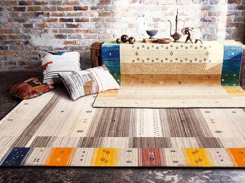 豊かな色彩と自然をモチーフにした魅力的なギャベデザイン。しっかりと目の詰まった織で作られたウールラグ。