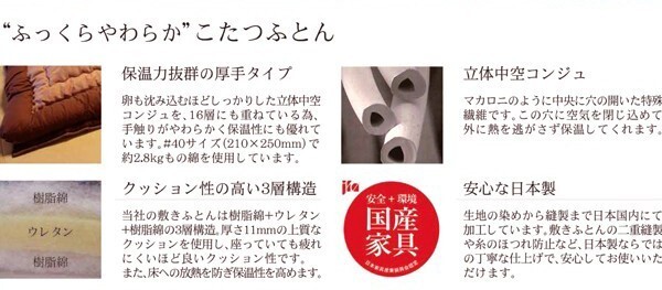長方形こたつ布団厚掛敷セット 120センチ巾こたつ用 KF-382※藍染の色をベースにした濃淡のある縞模様に朱色のラインをアクセントとして加えました。落ち着いた和風テイストです。ボリュームたっぷりでへたりにくく、暖かさを長く保てます。安心、信頼の国産品(日本製)です。※掛け布団 サイズ:210×250センチ 表地:綿100% 裏地:綿100% 中綿:ポリエステル100% 中綿:2.8KG サロン付き※敷布団 サイズ:幅210×奥240 表地:綿100% 裏地:綿100% 中綿:2.1KG 長方形コタツ用ふとん掛け敷きセット☆落札、ご入金確認後 1~2日にて発送いたします 追加納期のかかるものは商品ページに記載いたしております よろしくお願いいたします。