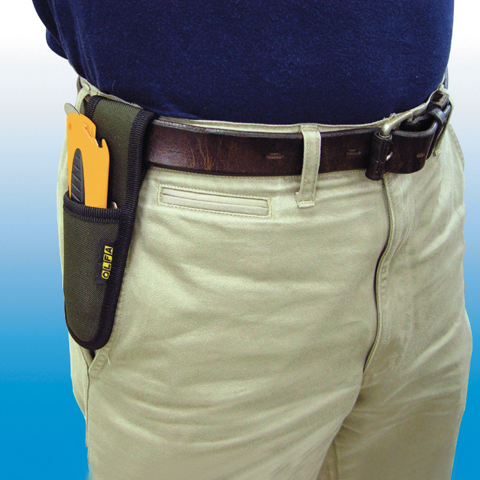 ベルトに装着でき、カッターナイフを携帯するのに便利なケース付き。