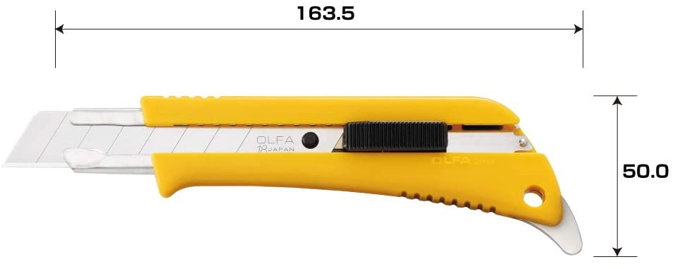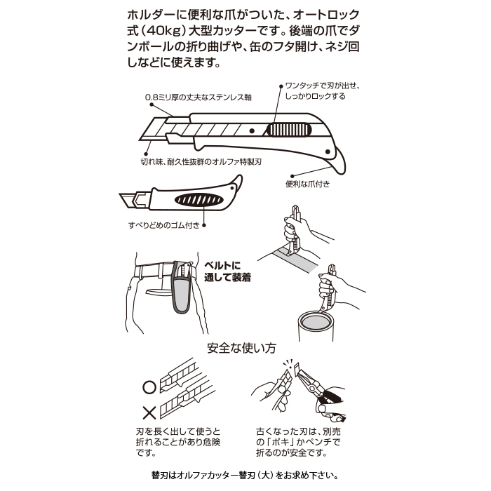 クラフトテープの開封やダンボールの折り曲げ、ペンキ缶などのフタ開けに便利なツメが付いた大型カッターナイフ。