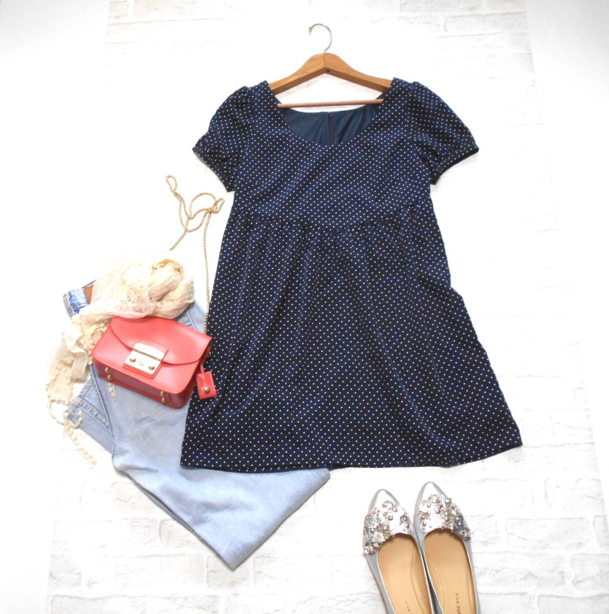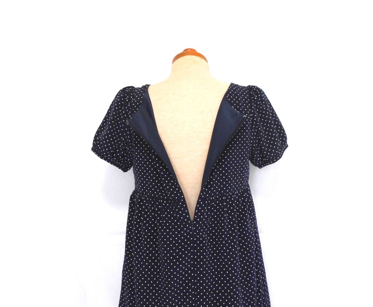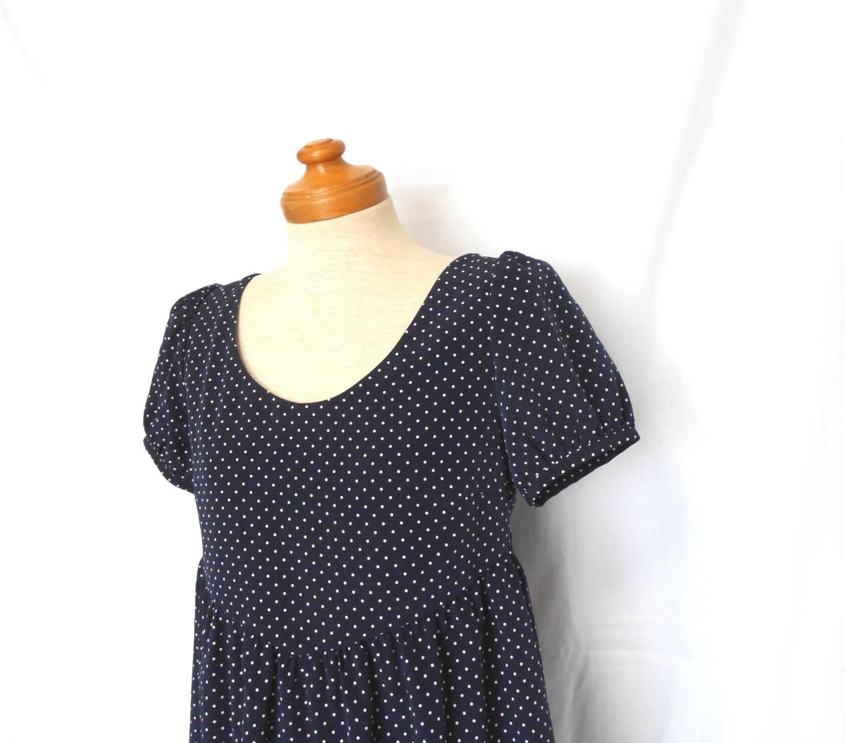 | ネイビーの水玉なので何色にでもあわせられて着まわしの幅が広いです。 | ||