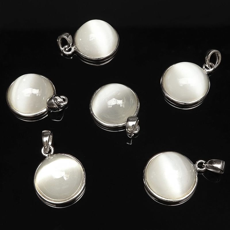 半透明のホワイトカラーの表面に浮かび上がるキャッツアイが美しいセレナイトのペンダントトップです。