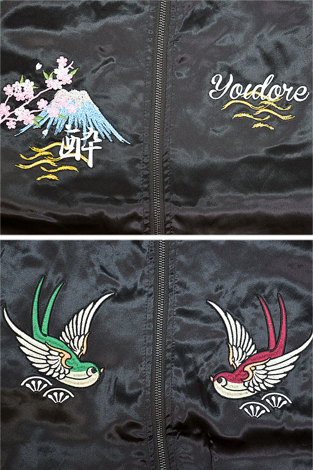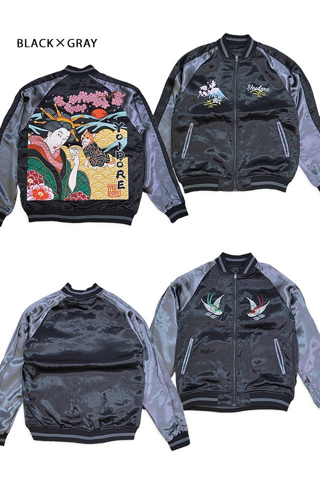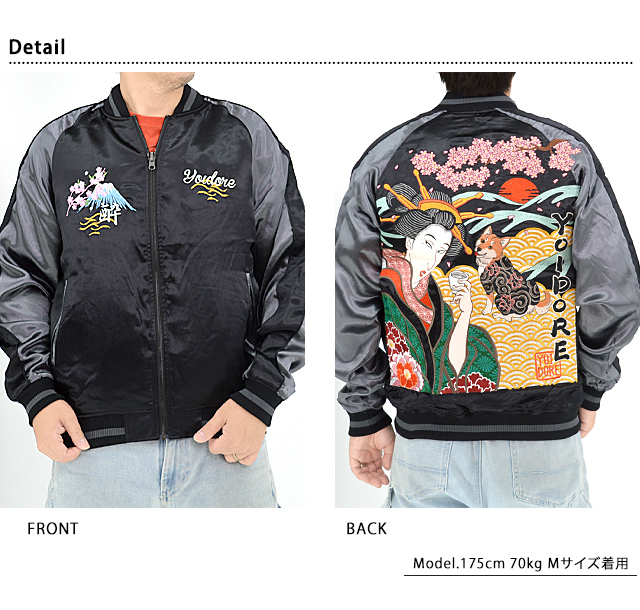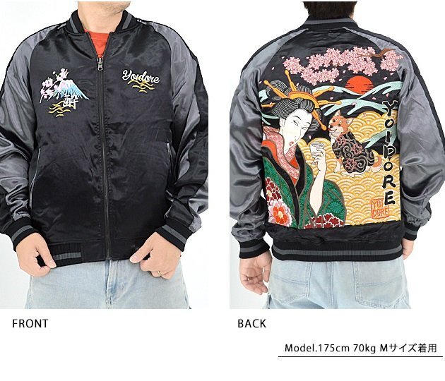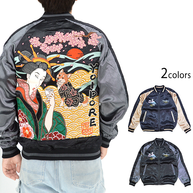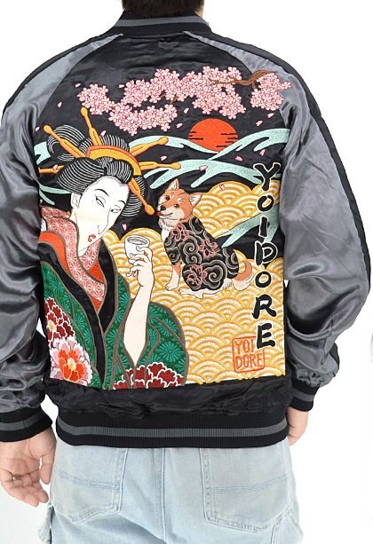 すべての酔いどれに届ける、酔いどれのためのブランド「YOIDORE」より「舞妓と犬 浮世絵スカジャン(834101)」が入荷してまいりました。 酔いどれ(酔っ払い)に届ける、酔いどれ(酔っ払い)のためのブランド。 お酒をテーマにした様々なデザインを落とし込んで展開しています。 気鋭のアーティストや酒造メーカー、人気ショップとのコラボレーションや、型にはまらない独特の世界感を表現した新感覚のアパレルブランドです。 老若男女お酒好きな方、お酒のお供にいかがでしょうか。 美味い酒には美女と犬! 桜と牡丹と朧月、フロントには桜富士とYOIDOREのワンポイント刺繍浮世絵デザインが酔いどれ心をくすぐる、渾身のパワーアイテムです。 高級感のある刺繍で粋と洒落を表現しました。 レーヨンサテン地を使用し、リバーシブル仕様で裏側のシンプルなワンポイントでも楽しめる本格派のスカジャンです。 | ||||||||||||||||||||