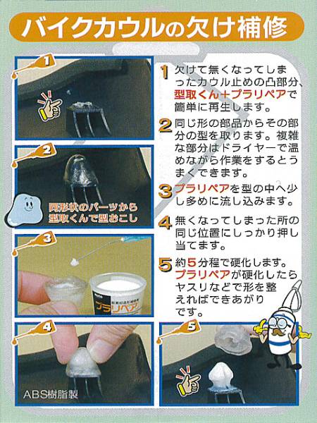 商品説明 | プラスチック修理の決定版!! 部品折れ、欠け、補修や再生、ねじ穴再生など・・・ あきらめていたこんなモノまで!?修理できます! 利用例をご用意いたしました、参考になさってください。 ※プラリペアシリーズの他の製品の例も含まれております、ご注意ください。 【セット内容】 プラリペアパウダー(透):30g プラリペア専用リキッド:50mL 専用ニードル スポイト リキッド用容器 小分けカップ 取り扱い説明書 ・この商品はPK-80から「型取くん」を除いたセットです。 ・少し大きめな部位の補修に最適です。 ・割れ、折れ、欠けの接着剤で困っていませんか? ・模り(かたどり)も出来るプラリペアです。 ・車のパーツの修復、オートバイのカウル、ねじ穴の修復、おもちゃ、パソコンなどあなたの大切な物の修復にプラリペアは欠かせません。 ・諦めてしまう前にぜひ、一度お試し下さい。 ・【プラリペアの長所】 ・エポキシ系より硬化が早く5分で固まります。 ・使いやすいので、なんでも修理したくなります。 ・瞬間接着剤など一度使ってまた使うとき中身が固まって使えないなんて経験ないですか? ・プラリペアは、粉と液の必要な分だけ使えます。 ・固まるとアクリル樹脂なので強度もバッチリです。 ・強度が強くノートパソコンなどのヒンジ部分もOK! ・硬化が早く5分で固まり仕事が速く進みます。 ・接着でのご使用でしたら少しの量で、経済的です。 ・必要な分量だけ混ぜて使いますので、長期保存可能です。 商品説明動画 |