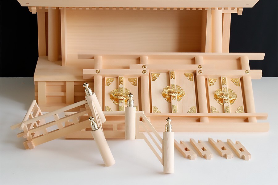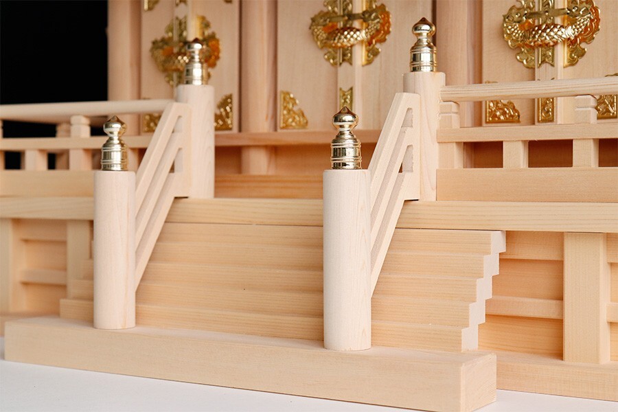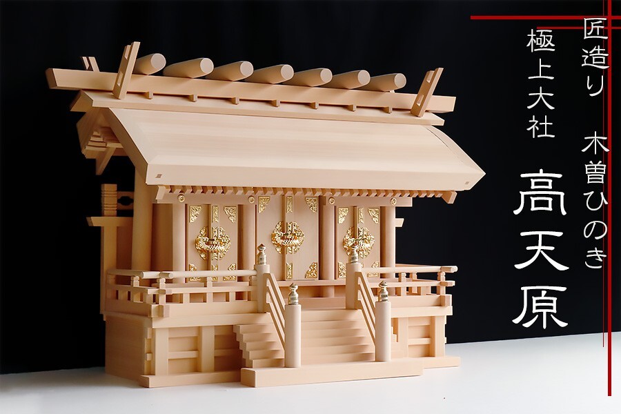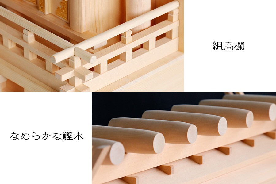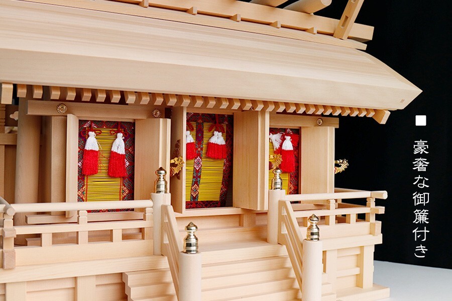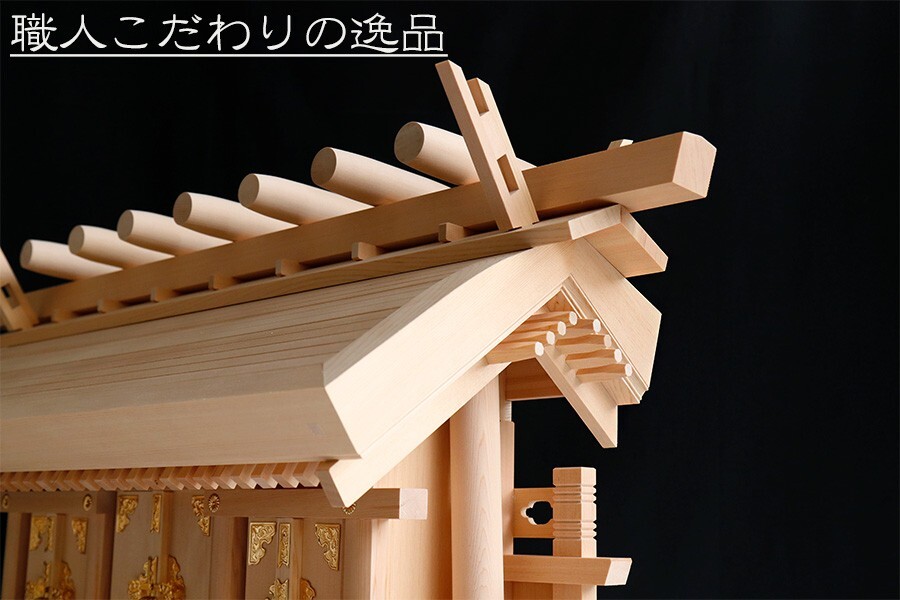 培われた木工技術をふんだんに盛り込んだ、「匠造り」シリーズの神棚。職人の技を集約した、工房手作りの逸品。木曽桧材の美しい木肌と繊細な組み上げにより、とても上品で高貴な雰囲気です。「尾州桧」「官材」等とも呼ばれる希少な木曽ひのき材は、神棚用としては最高級品のみに使用されます。 厚屋根が特徴の存在感ある極上大社。屋根は木目が揃うよう職人が厳選し製造しています。 鰹木・垂木・小狭木舞など細かな部分の仕上げにもこだわった最高級クラスの神棚。 大きなお札を納められる神棚をお探しの方はもちろん、インパクトのある極上神棚をお探しの方にもご好評いただいております。 | |||