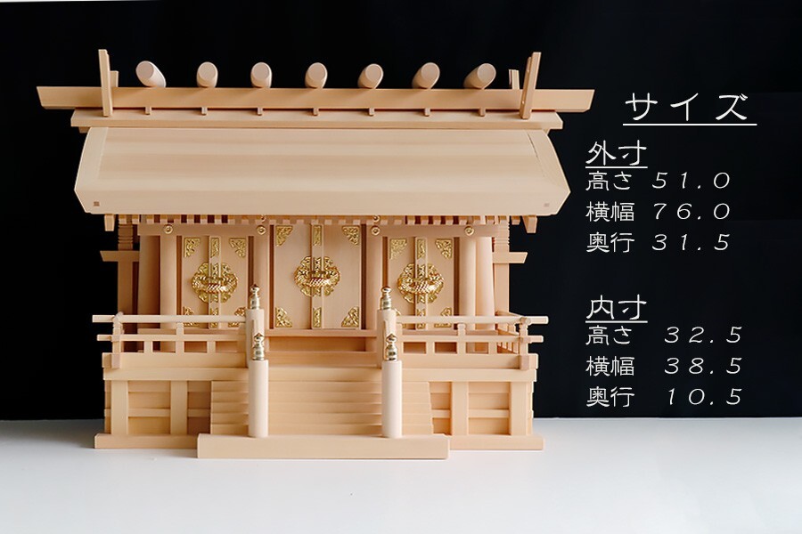 ■神棚の大きさ 高さ51cm 幅76cm 奥行31.5cm ■お神札が入るスペース 本社:高さ32.5cm 幅38.5cm 奥行10.5cm | |||