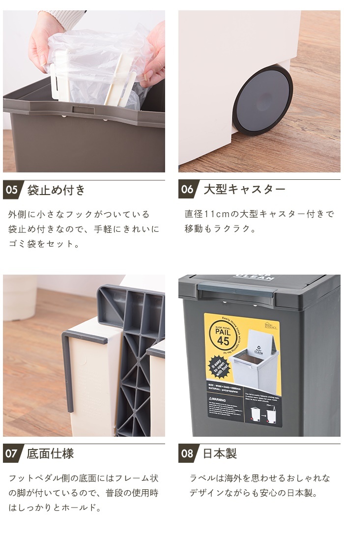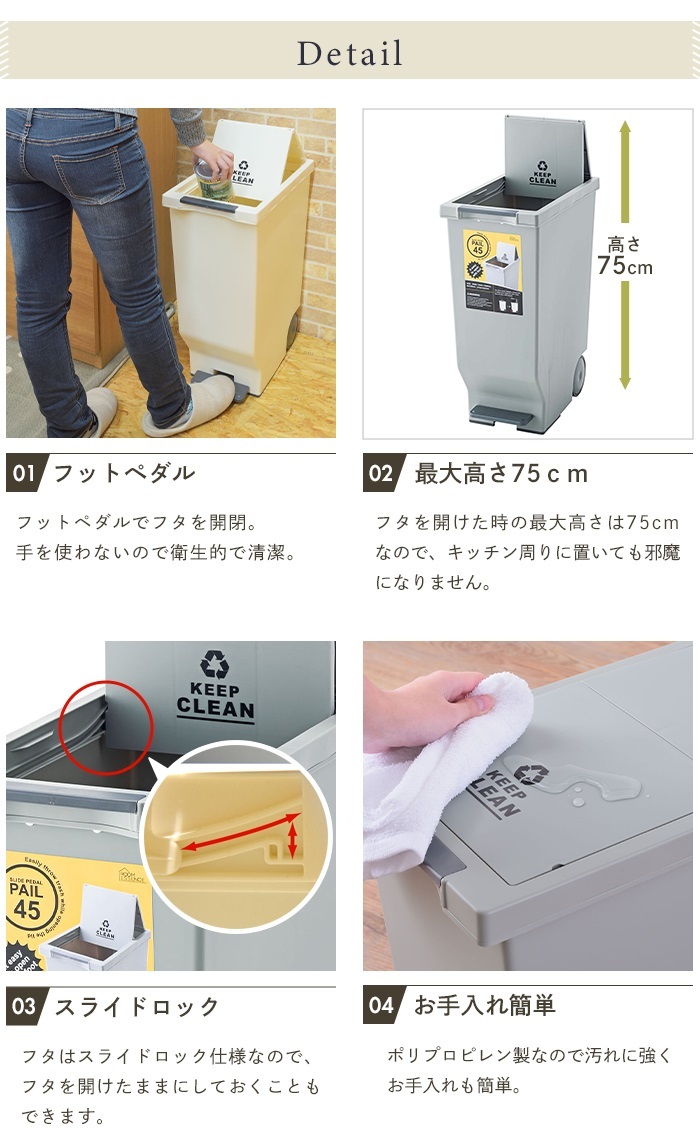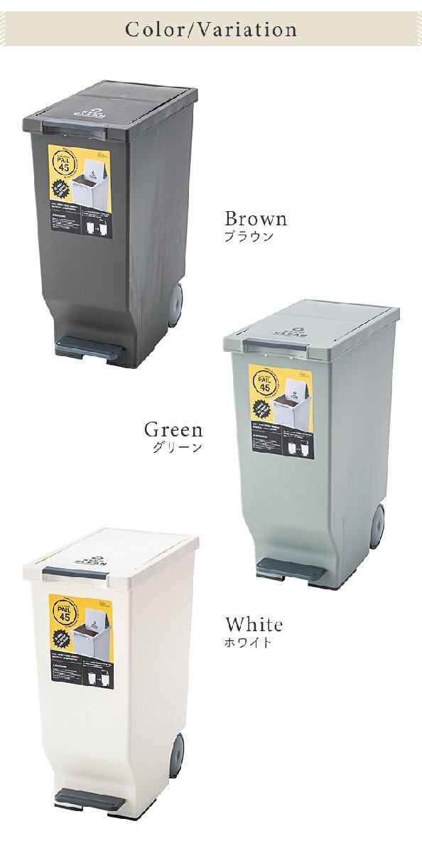 | ※【同シリーズ】のリンクは当店のヤフオク店のページへ進みます。 ● スタッキングペール [スリム]30L / 45L [ワイド]30L / 45L ● スライドペール:30L / 45L ● スライドペダルペール:45L ● ラウンドペール:45L ● バラフライペダルペール:32L ※このページは[スライドペダルペール 45L]を販売しております。 |
