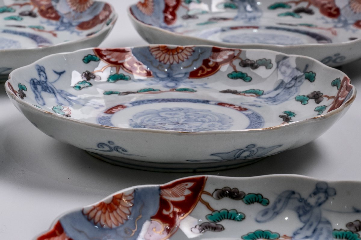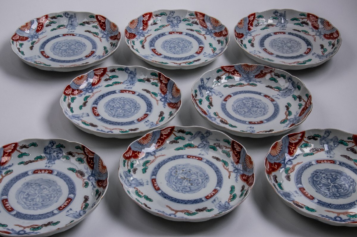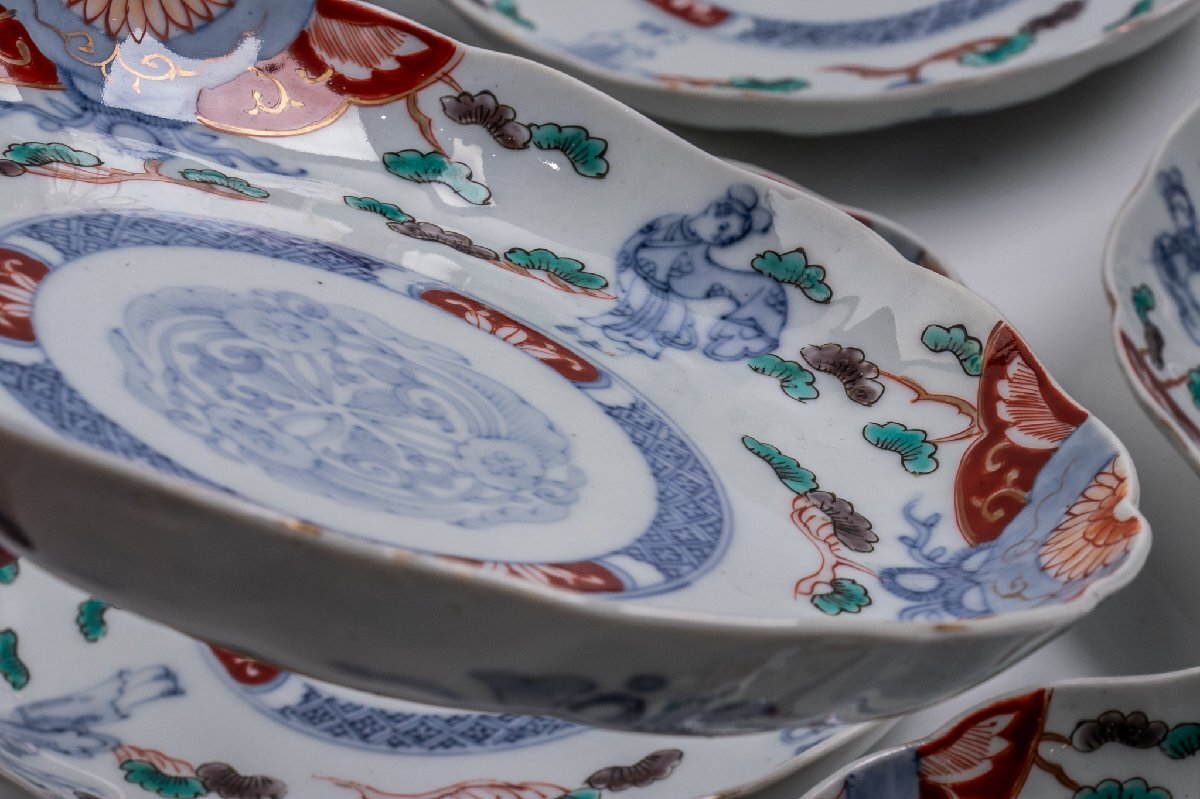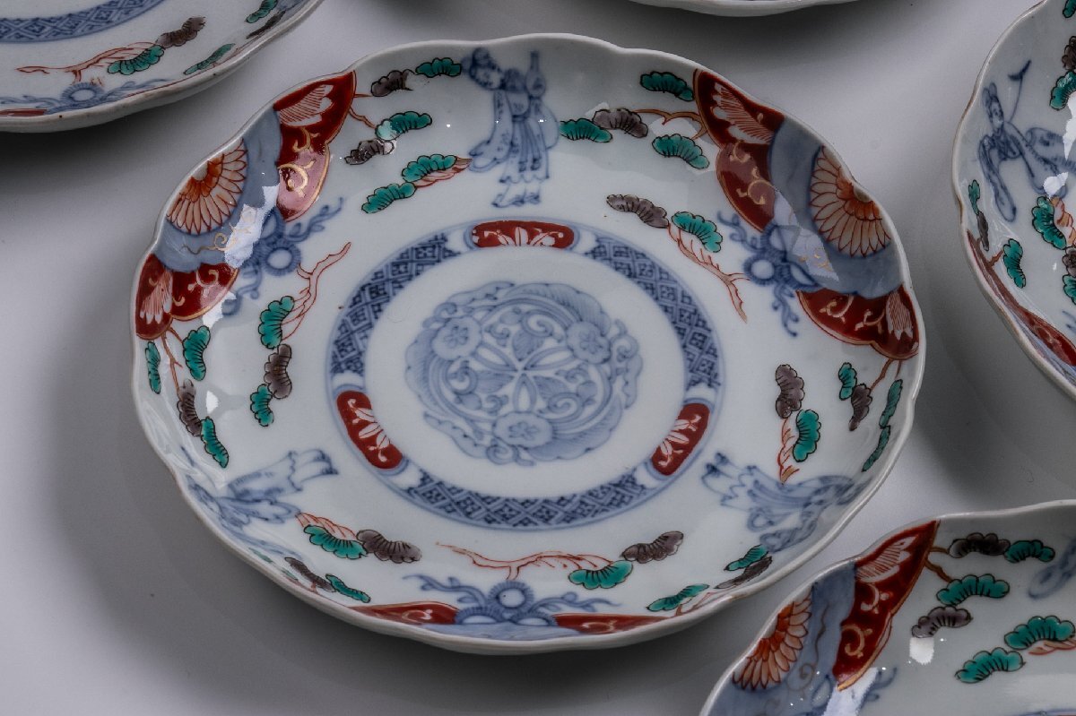 【うつわ】 古伊万里 染錦草花人物文七寸皿 8客 明治時代 E825C バラ売り可能です 古美術 骨董 古玩 陶芸 日本料理 懐石 料亭