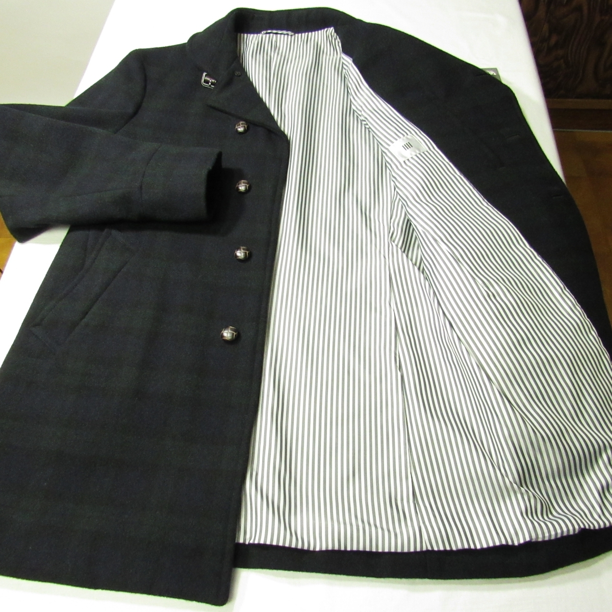 ブラックウォッチのメルトン生地を使用したコートです。 ボタンはバスケットボタンに似せたプラスチックボタンです。 メンズ・メルトン・ブラックウォッチ・コート/秋冬 型番:SLT1501-99 ノーベント/裏地-総裏/肩パッドなし |