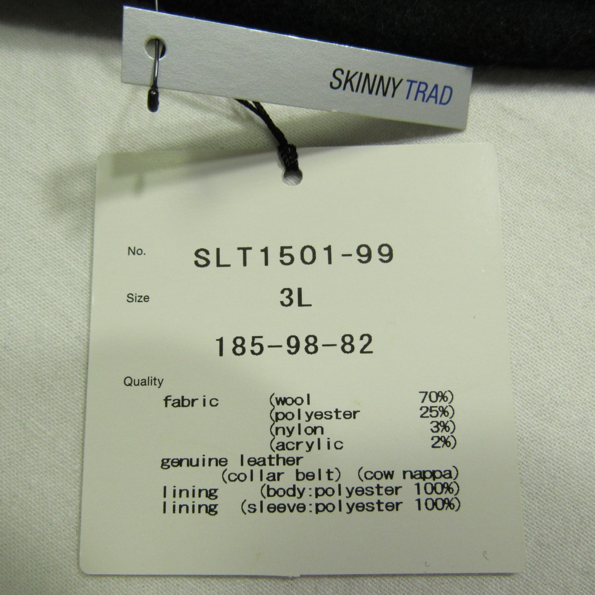 表記サイズ 3L 身長185 チェスト98 ウエスト82 SKINNY TRAD (SKINNYモデルですので細身のつくりだと思います。記載の実寸サイズをご参考にしてください。) 実寸サイズ(cm) 身幅/55 肩幅/48 着丈/84 袖丈/65.5 ゆき丈/89 1番細い位置の胴幅/52.5 |