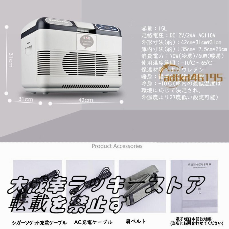 カラー:白&灰色本体重量(約):6kg庫内寸法(約):350*175*250mm外形寸法(約):420x310x310mm電圧:DC12V・DC24V/110V材質:ABS樹脂、アルミニウム、ポリウレタン容量:15L消費電力:60-70W使用温度範囲:-10℃~65℃パッケージ内容:15L車載冷蔵庫本体、AC充電ケーブル、シガーソケット充電ケーブル、肩ベルト、日本語説明書。