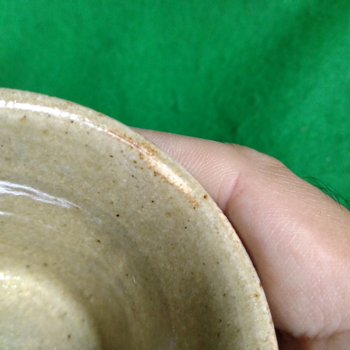 口縁は全体的にザラッとした手触りです。窯傷(釉剥げ・ひっつき)があります。複数枚、写真に撮ってますのでご参照ください。