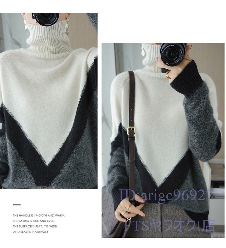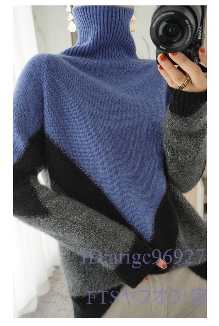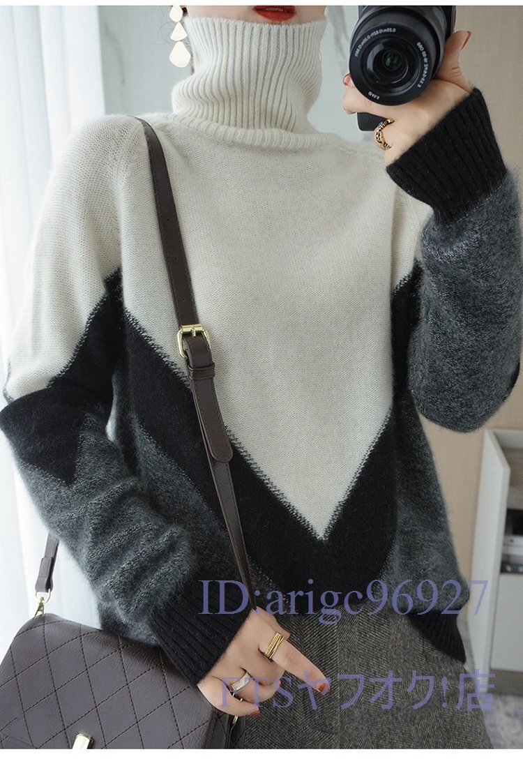 A0527☆新品M-XLサイズ カジュアル 配色柄 ニットセーター おしゃれ ミンクカシミヤ混 ハイネック 暖かい ニットトップス*キャメル