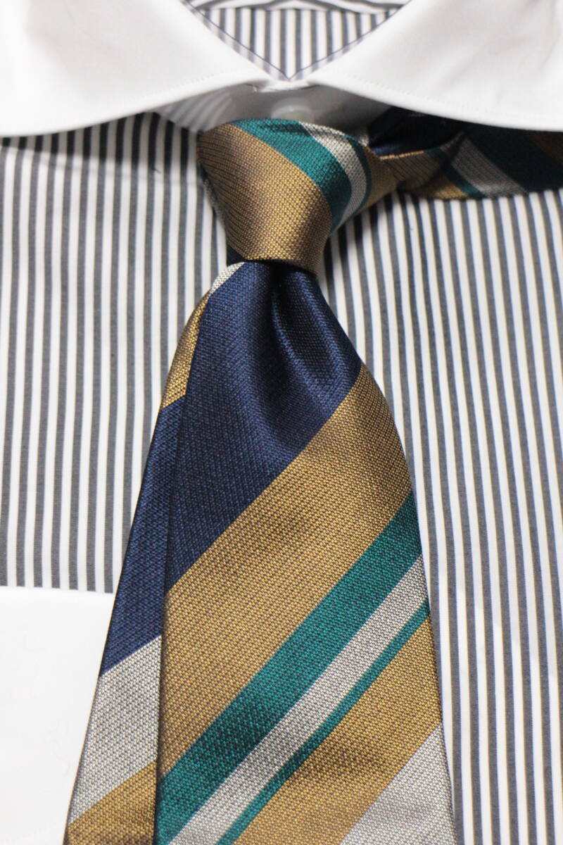 ネオトラッドな印象を醸し出す、モダンクラシックな配色の妙が素敵なレジメンタル。