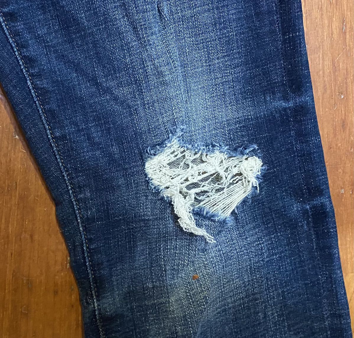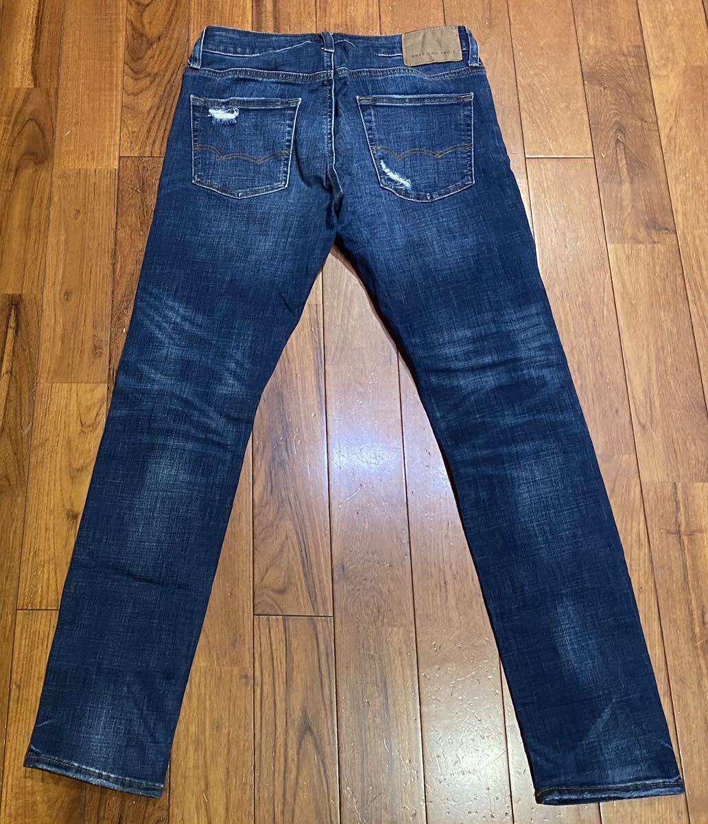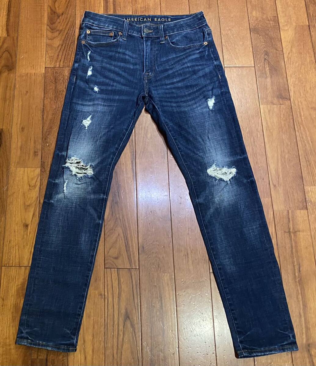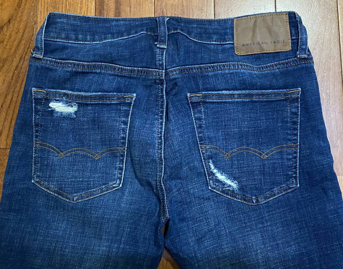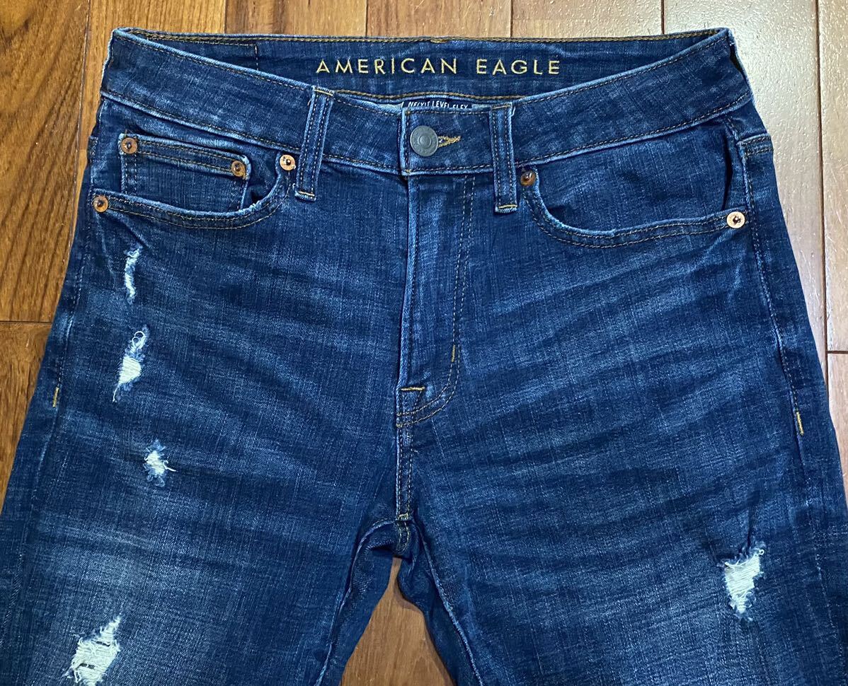 アメリカンイーグルのストレッチスリムテーパードデニム(ジーンズ)、NE(X)T LEVEL FLEX SLIM TAPERです。色はインディゴブルーです。USEDで左膝のダメージ加工部分にほつれありますが状態は良いです(10段階中7程度)。生地はストレッチ入りでコットン85%、ポリエステル13%、ポリウレタン2%です。紙パッチ、ジッパーフライ、裾はチェーンステッチです。正規品です((株)イーグルリテイリング、中国製)。サイズはW29×L30でウエストは重ねずに平置きで約77cm、ヒップ約98cm、股上約25cm、股下約77cm、股下15cmのふともも部分約50cm、裾まわり約30cm、重量約550gです。発送はゆうパケットポストになります。