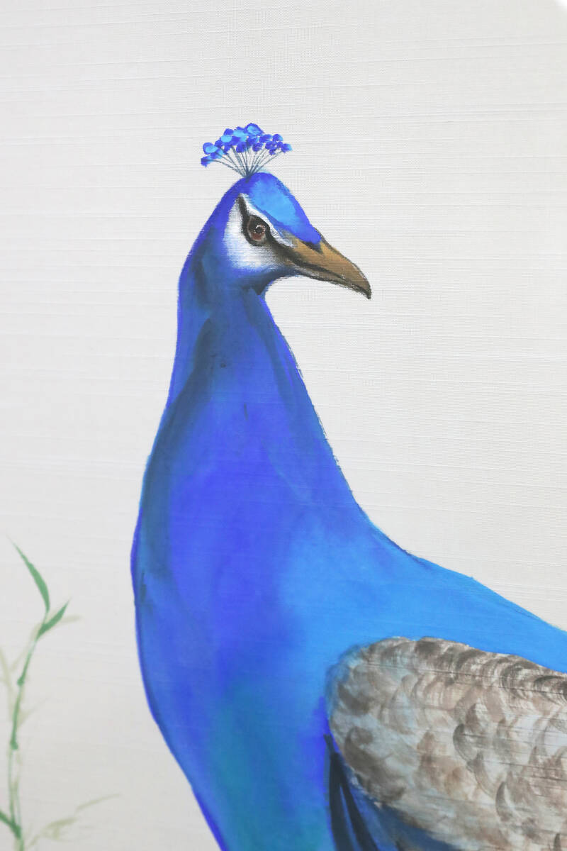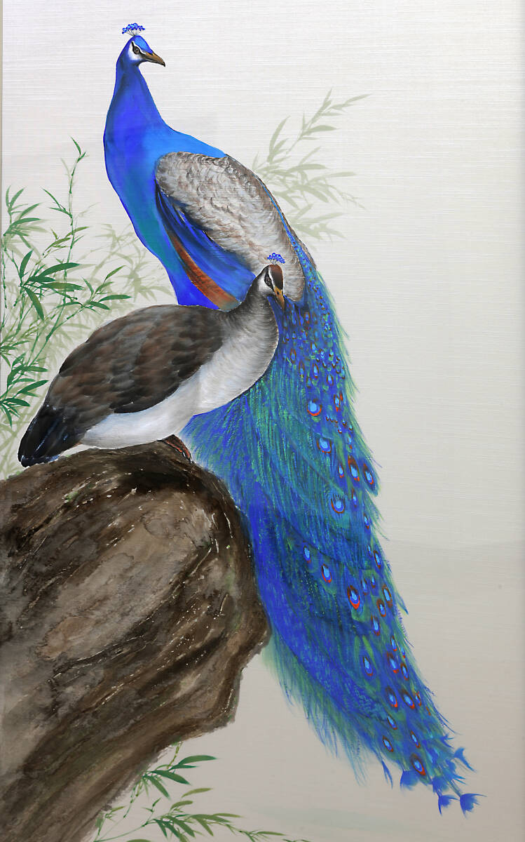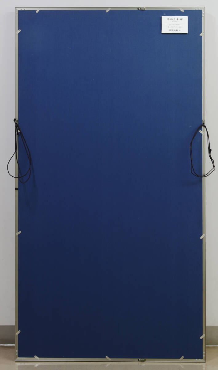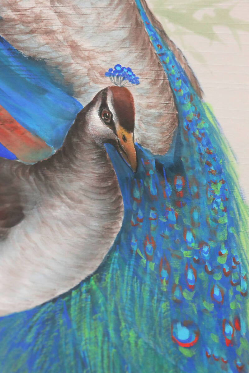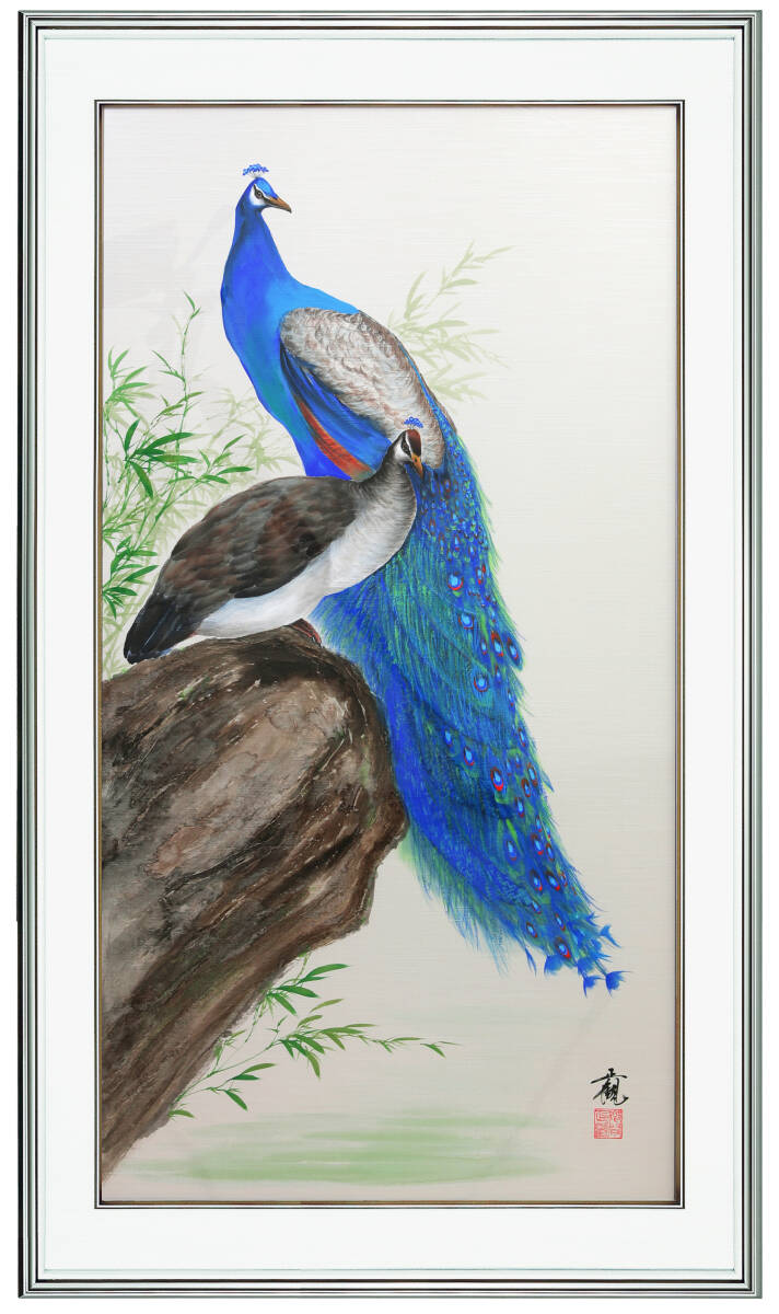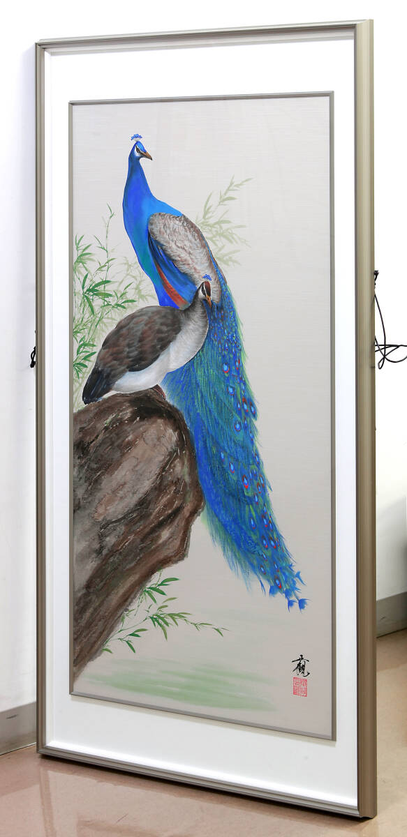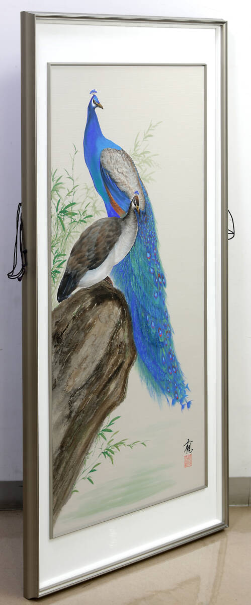 【真作】郷間正観作『平和と幸福(碧孔雀)』【状態良好】絹本墨色著色アルミ額装絵 令和2年春作 額寸法:幅約90cm×高約170cm×厚約5cm