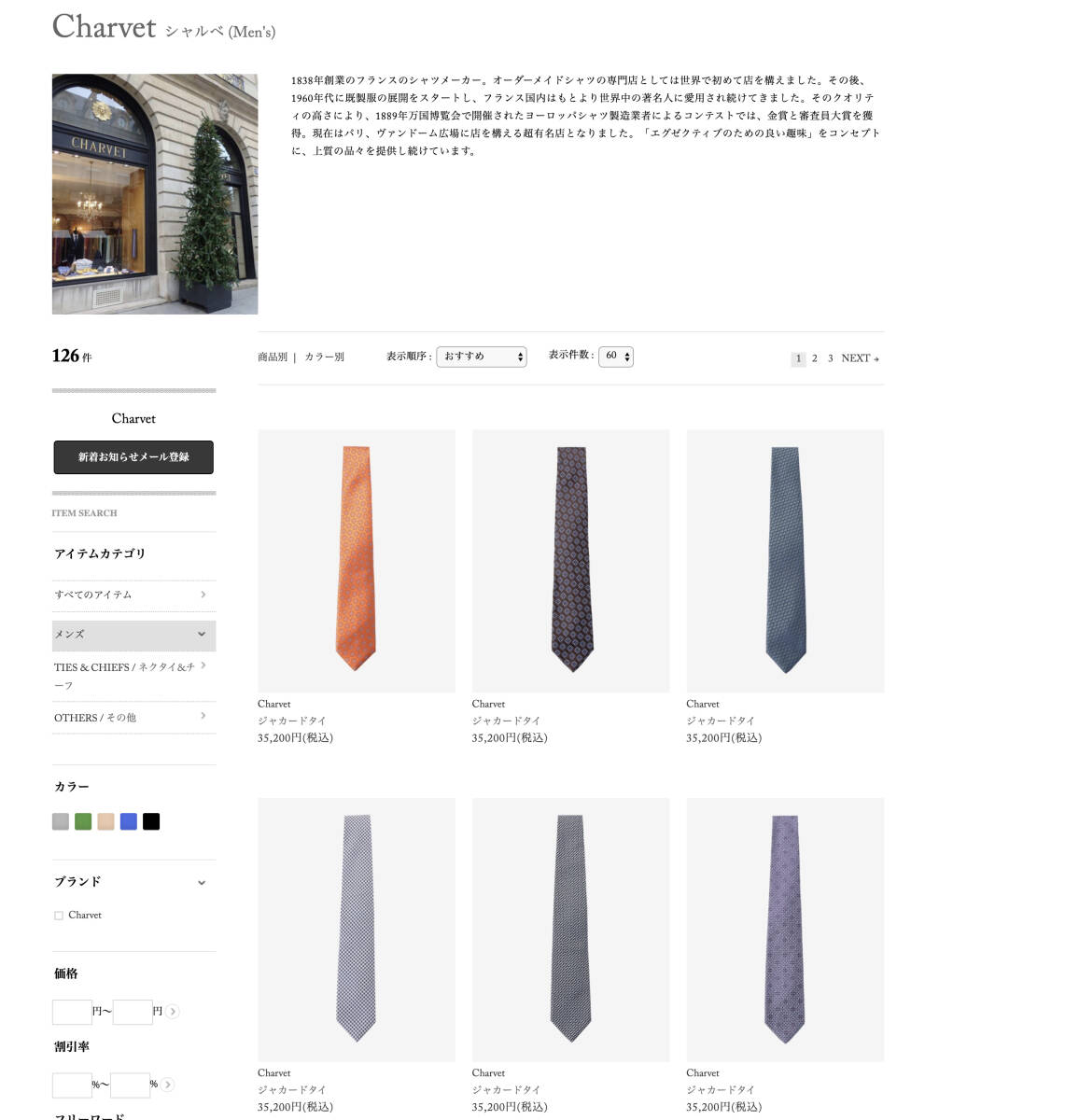 1838年創業のフランスのシャツとネクタイ、スーツからパジャマまですべて揃うハーバーダッシャーであるシャルベは、世界最高峰のタイを作っています。オーダーメイドシャツの専門店としては世界で初めて店を構えたのち、1960年代に既製服の展開をスタート。フランス国内はもとより世界中の著名人に愛用され続けてきました。そのクオリティの高さにより、1889年万国博覧会で開催されたヨーロッパシャツ製造業者によるコンテストでは、金賞と審査員大賞を獲得。現在はパリ、ヴァンドーム広場に店を構える超有名店となりました。
