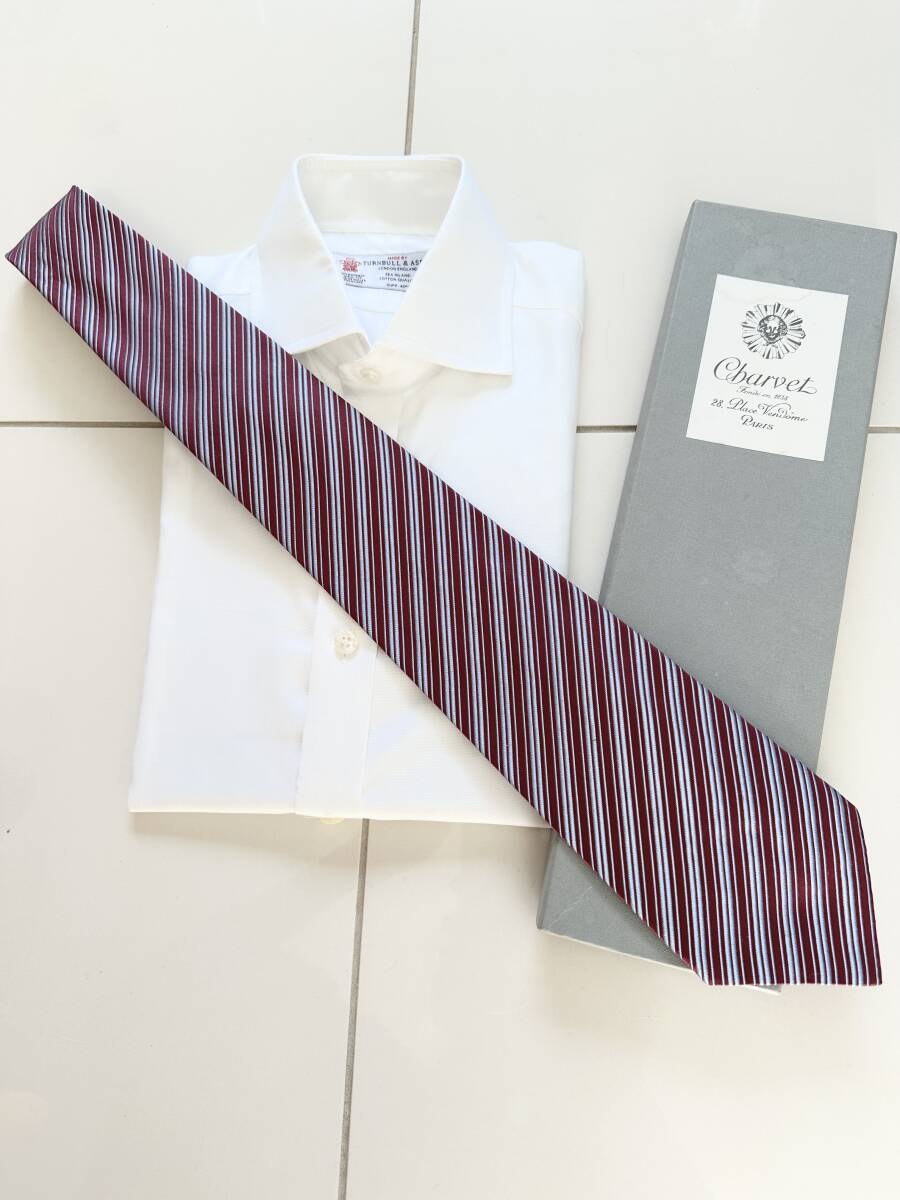 ・シャルベ以外にも、ボレッリやキトン、ターンブルアンドアッサーなどのシャツと合わせてみてください。他にもネクタイはブリオーニやバティストーニ、Kiton、ZIlli、ラルフローレンパープルレーベルを出しております。お買い求めくださいませ。