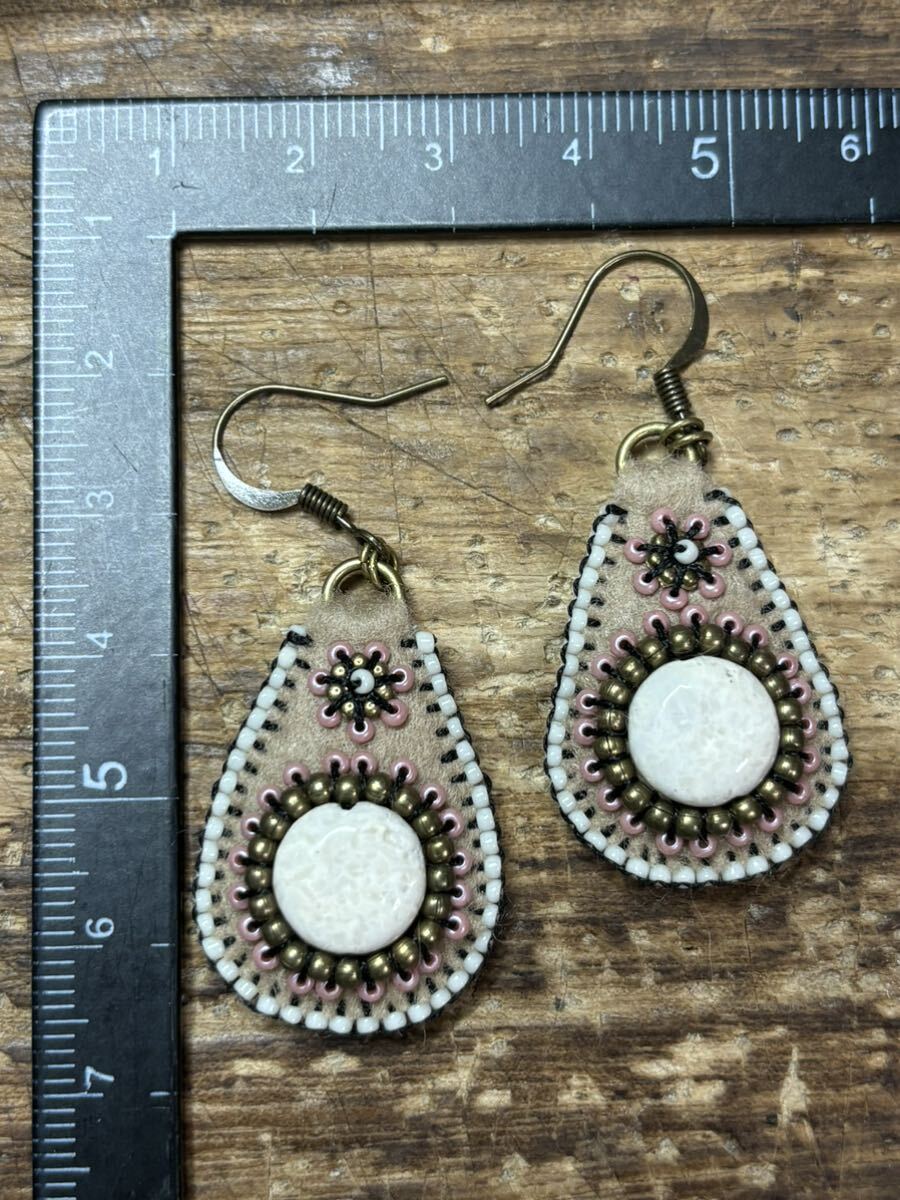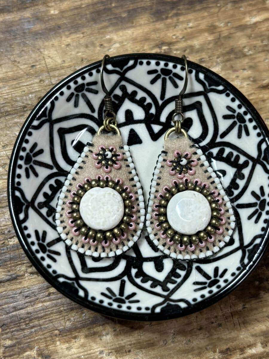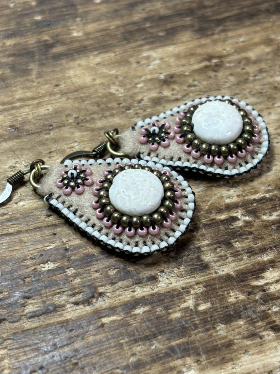 とても可愛いピアスが出来上がりました。天然石リバーストーンのパフコインをビーズ刺繍でボヘミアン調のフックピアスに仕上げました。他の石でも制作中です。