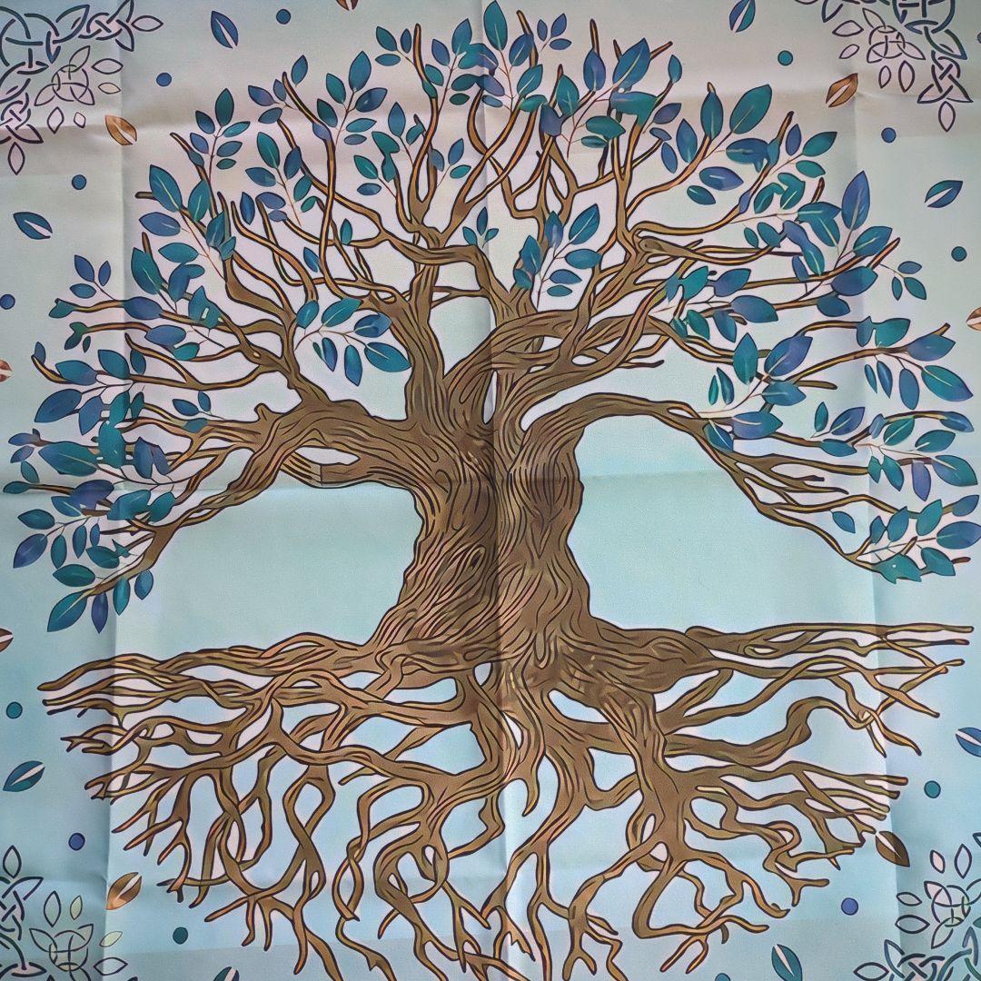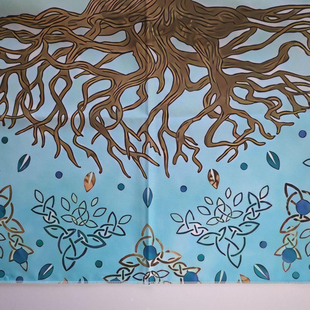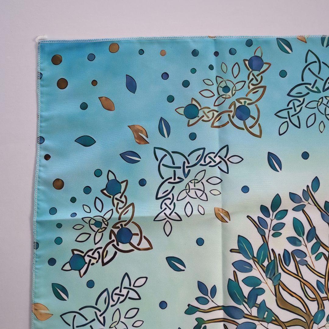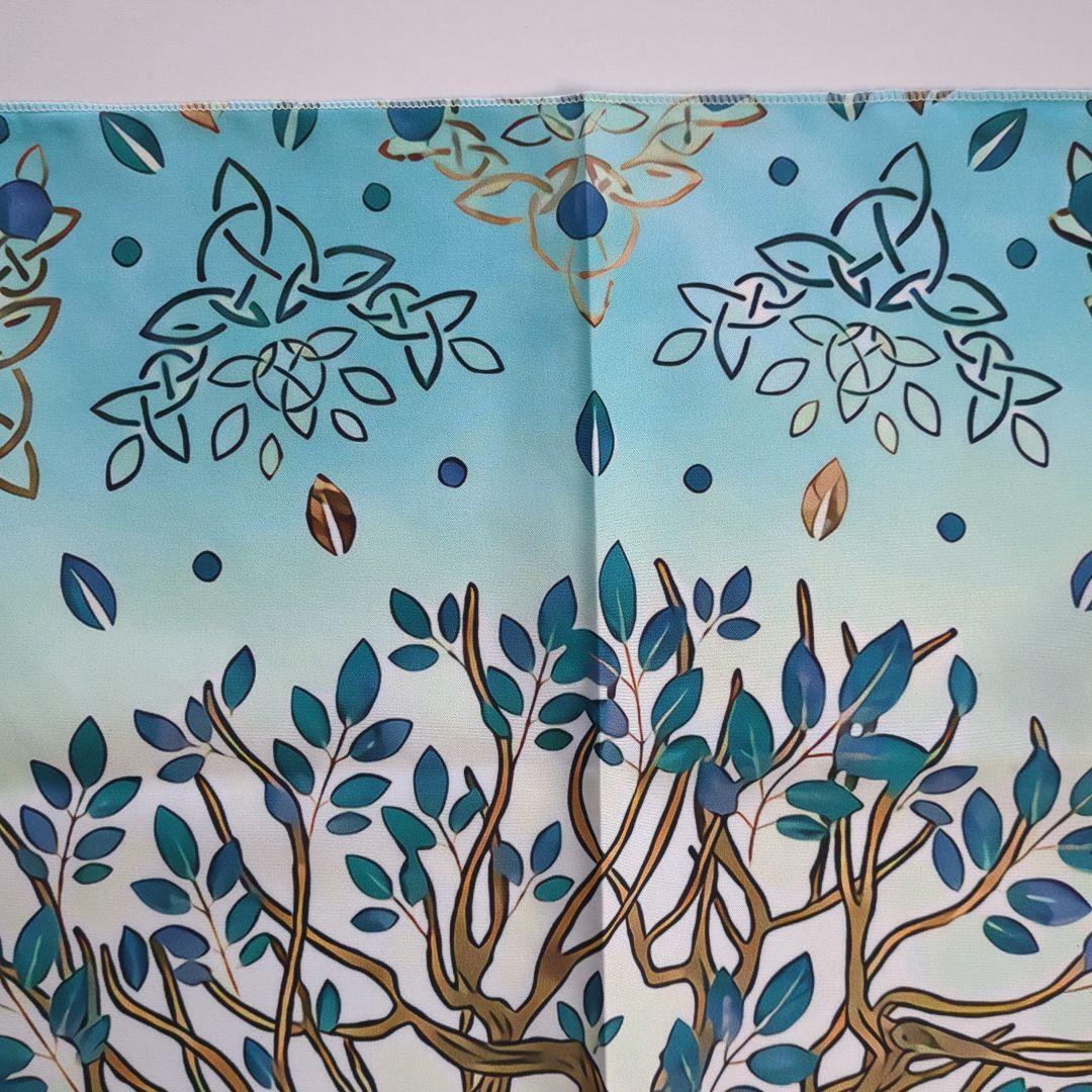 ライトブルー地に生命の木(ツリーオブライフ)と、古代ケルトの神聖幾何学模様であり三位一体を表すトリケトラがあしらわれた、神秘的かつ華やかでかわいい図柄です。