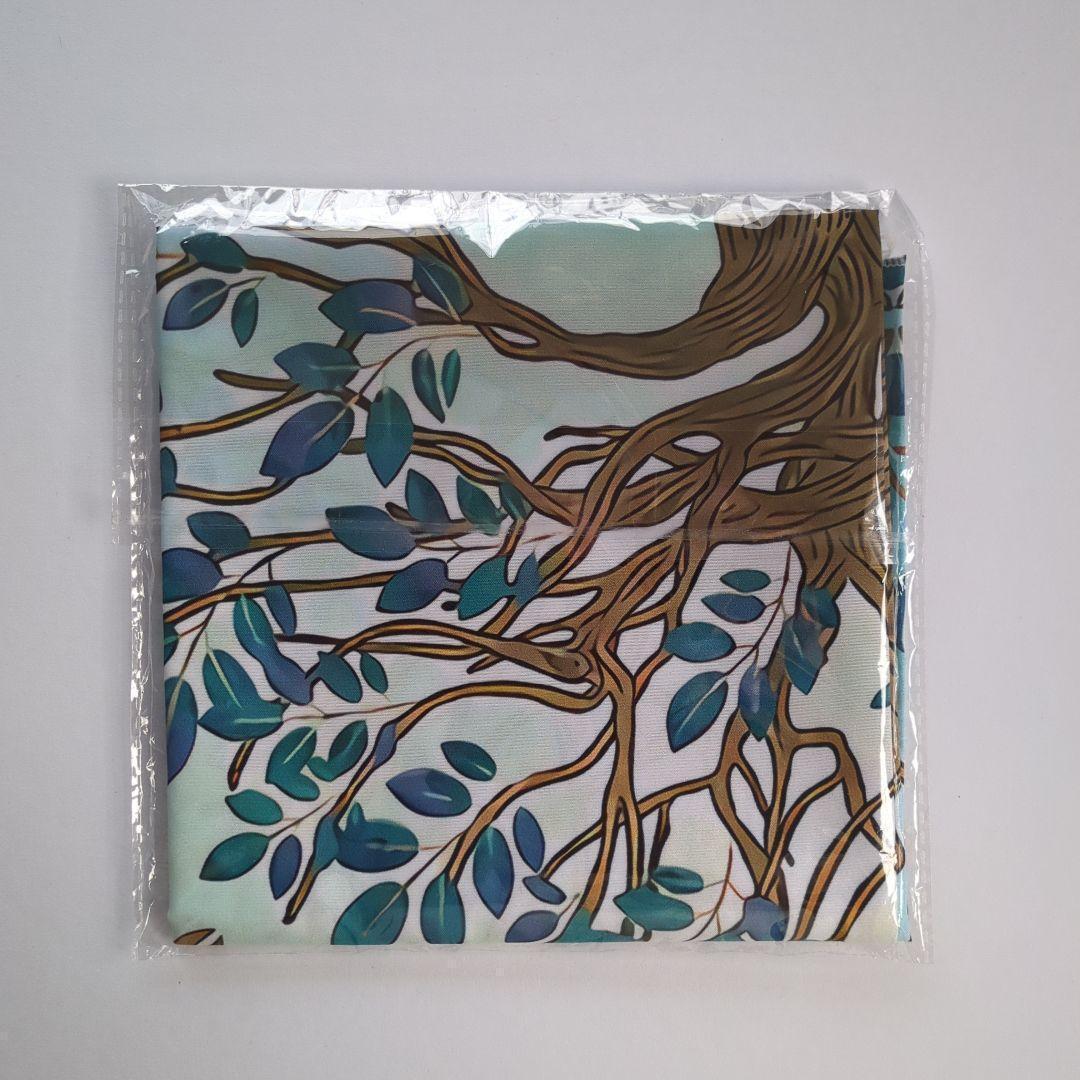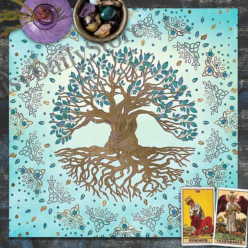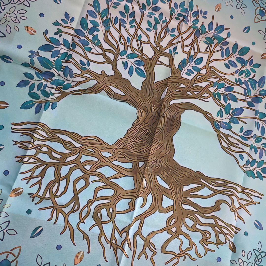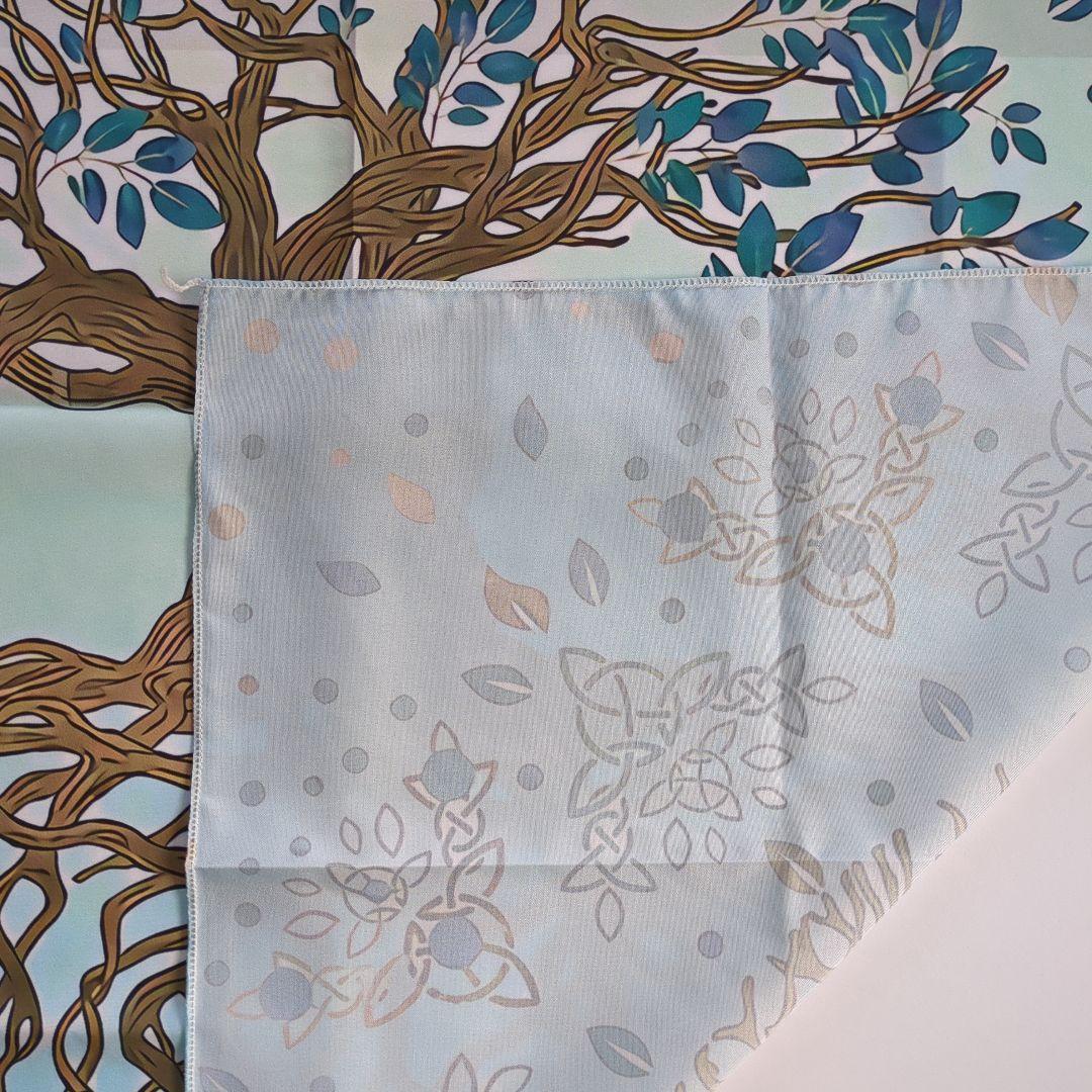 ライトブルー地に生命の木(ツリーオブライフ)と、古代ケルトの神聖幾何学模様であり三位一体を表すトリケトラがあしらわれた、神秘的かつ華やかでかわいい図柄です。