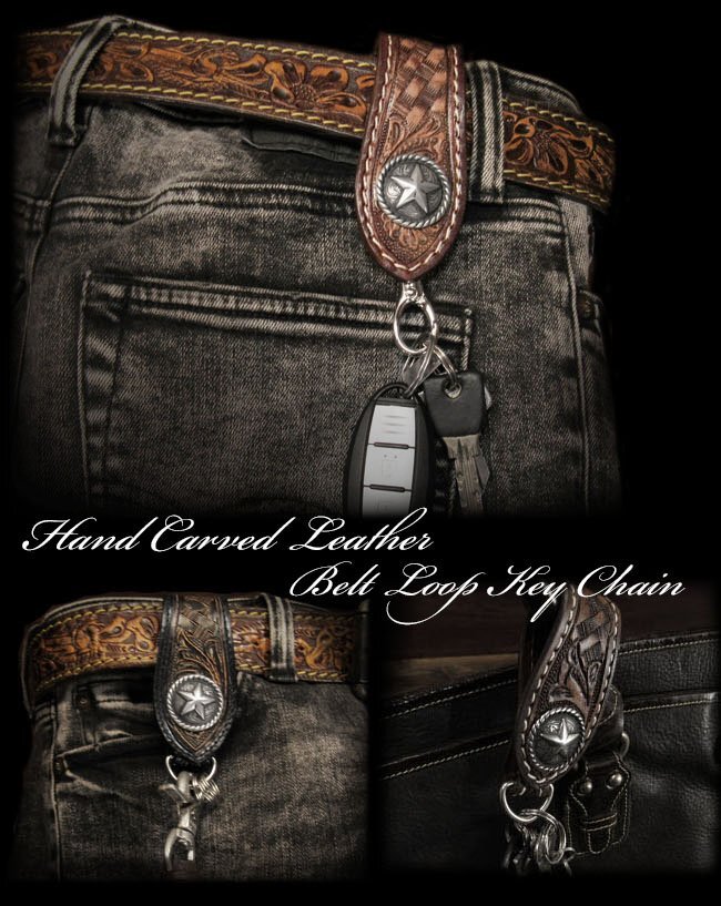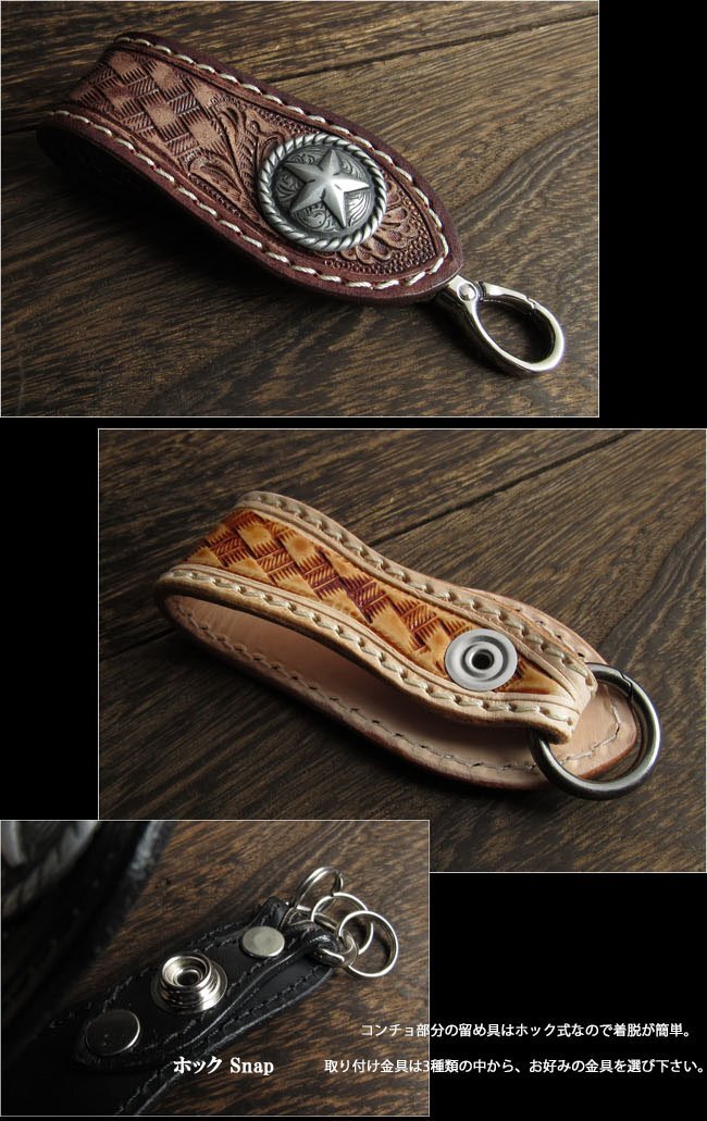 革職人により1つ1つ手彫でカービングをあしらった本革ベルトループ型キーホルダーです。コンチョ部分の留め具はホック式なので着脱が簡単。ベルトに通したりバッグにぶら下げたり使い方いろいろです。