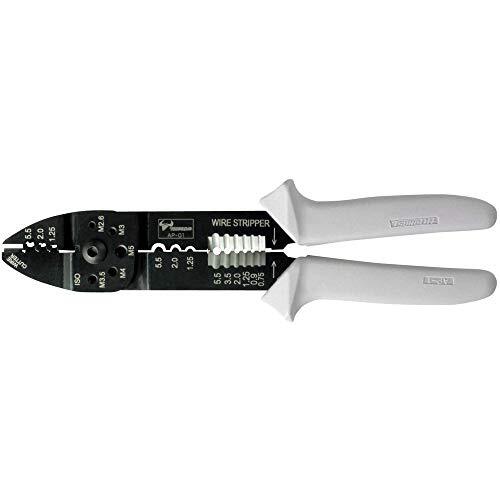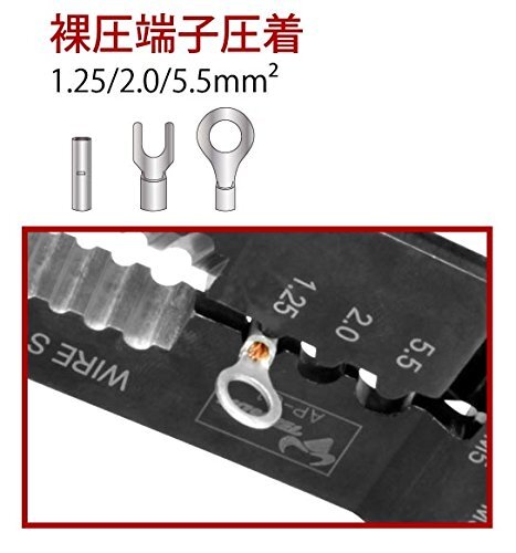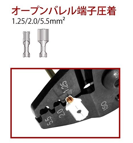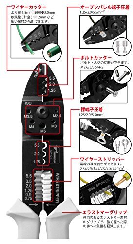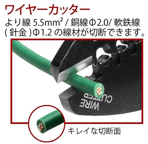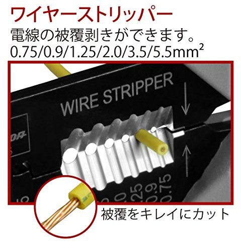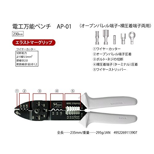 「ツノダ(TSUNODA) 電工万能ペンチ オープンバレル(ギボシ)端子・裸圧着端子両用 AP-01」▼4952269113907▼(商品説明)オープンバレル(ギボシ)端子・裸圧着端子両用・黒 AP-01・・Style:オープンバレル(ギボシ)端子・裸圧着端子両用・ユニット数:1・手に優しいエラストマーグリップを採用しています。・原産国:日本・梱包サイズ:26.8cm×2.6cm×8.2cm説明 『配線に必要な5つの機能を装備』 自動車の電装整備や屋内配線作業に。 グリップは弾力のあるエラストマー素材で、強く握った際の手への負担を軽減。 機能 1.ワイヤーカッター 2.オープンバレル端子圧着 3.ボルト・ネジの切断 4.裸圧着端子(ターミナル)圧着 5.ワイヤーストリッパー