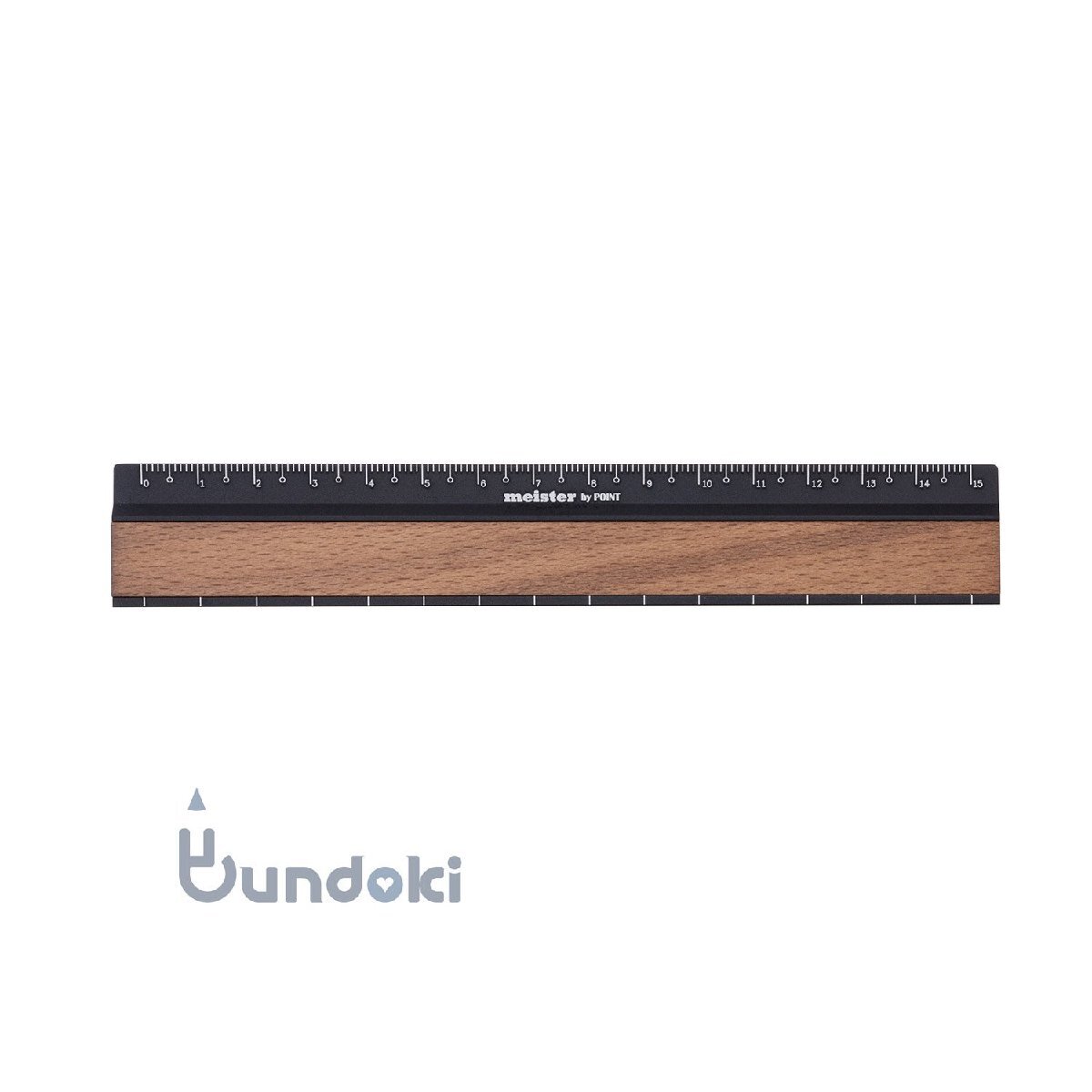 紙面が見やすいように究極の薄さまで削られた目盛り部分と手に触れる部分は、木目の重厚感を感じていただけるように2 oの板厚を確保された15センチ定規。
