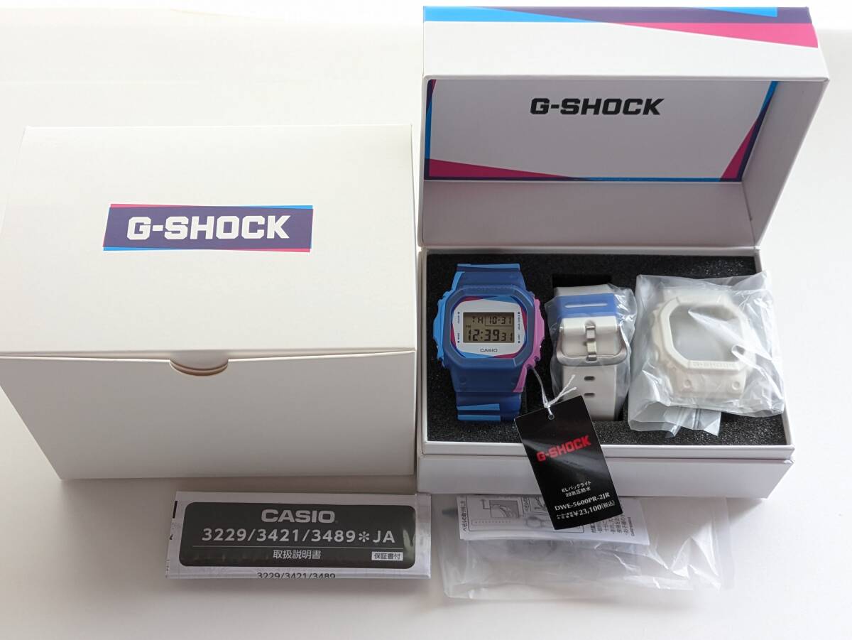 1983年の発売以来、飽くなき強さを求めて進化を続けるタフネスウオッチG-SHOCKから、プリントの際に偶然起こる印刷のズレや重なりをデザインに落とし込んだモデルです。 印刷の微妙なズレによる視覚効果がユニークな表現となり、ファッションアイテムとしても活用できるクールなデザインとなっています。 ベースモデルにDWE-5600を採用し、スケルトンバンドを採用したブルーに加え、ホワイトをベースにした交換用のバンドとベゼルをセットにしました。 その日の気分やファッションに合わせて着け替えることが可能なG-SHOCKです。
