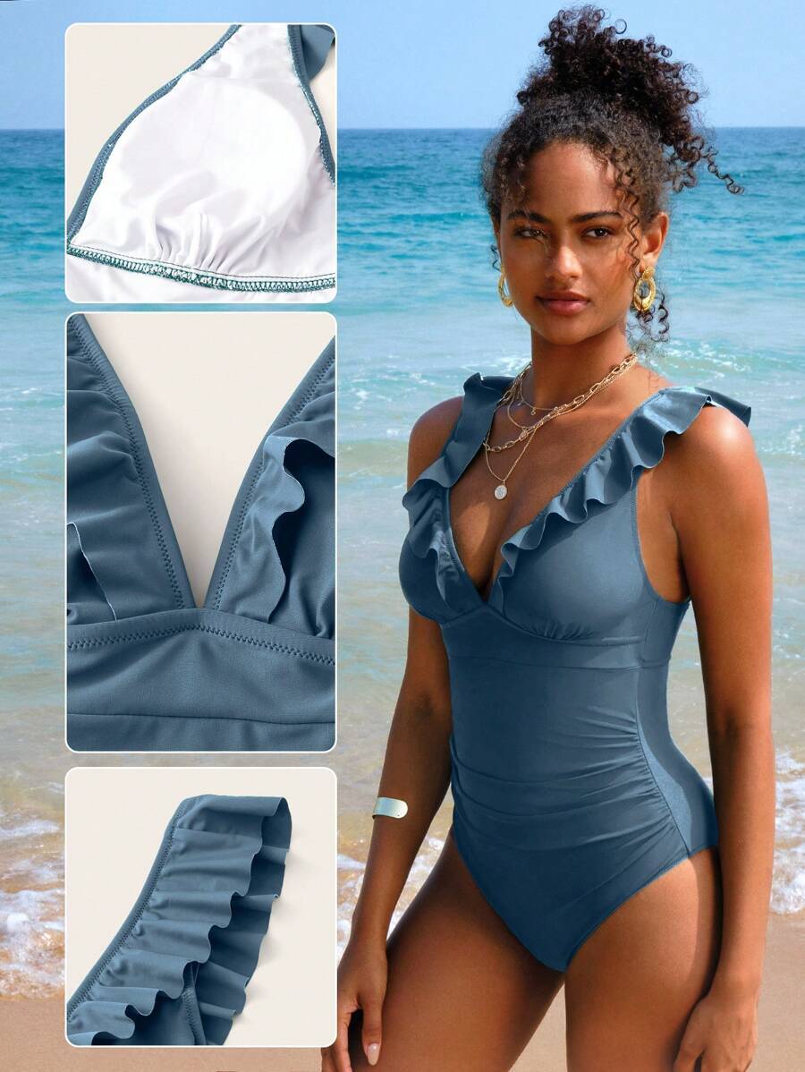 レディース 水着 ワンピース フリルトリム ルーチェドワンピース水着、バックレス、結び目付き、ビーチバケーションに最適 単色