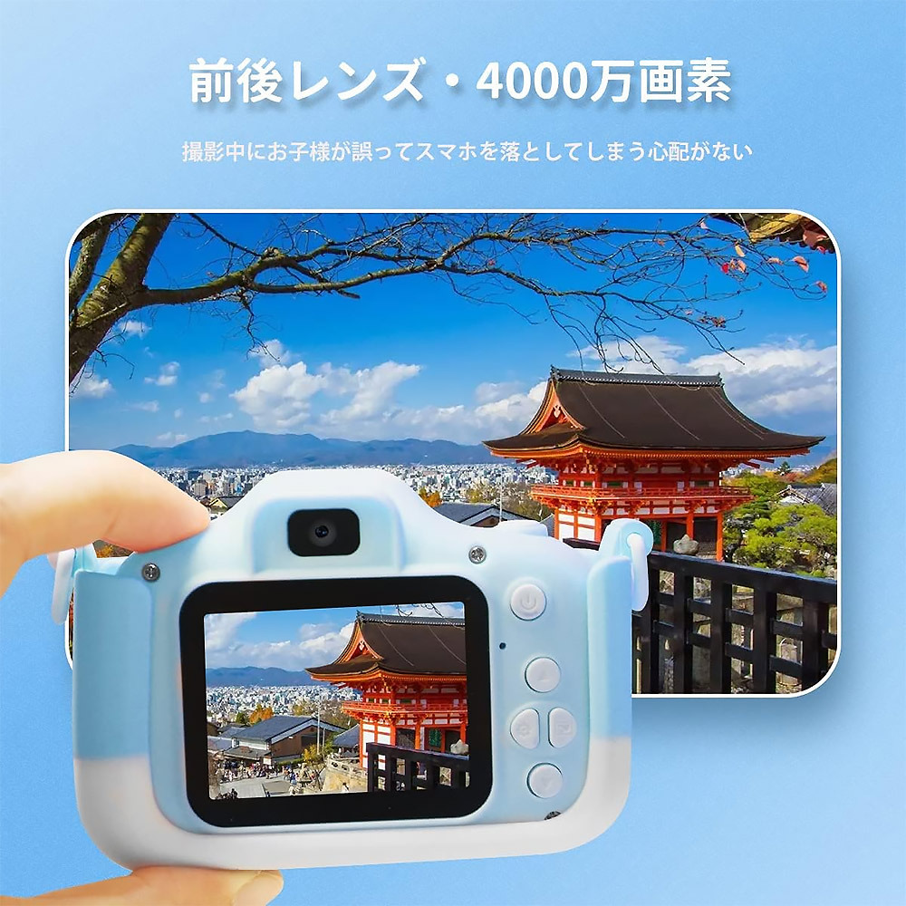 4000万画素の静止画と、1080PのHD動画を撮影可能、前面と背面のレンズ、8倍デジタルズーム機能、タイムラプス機能により、お子様も楽しく撮影することができます。