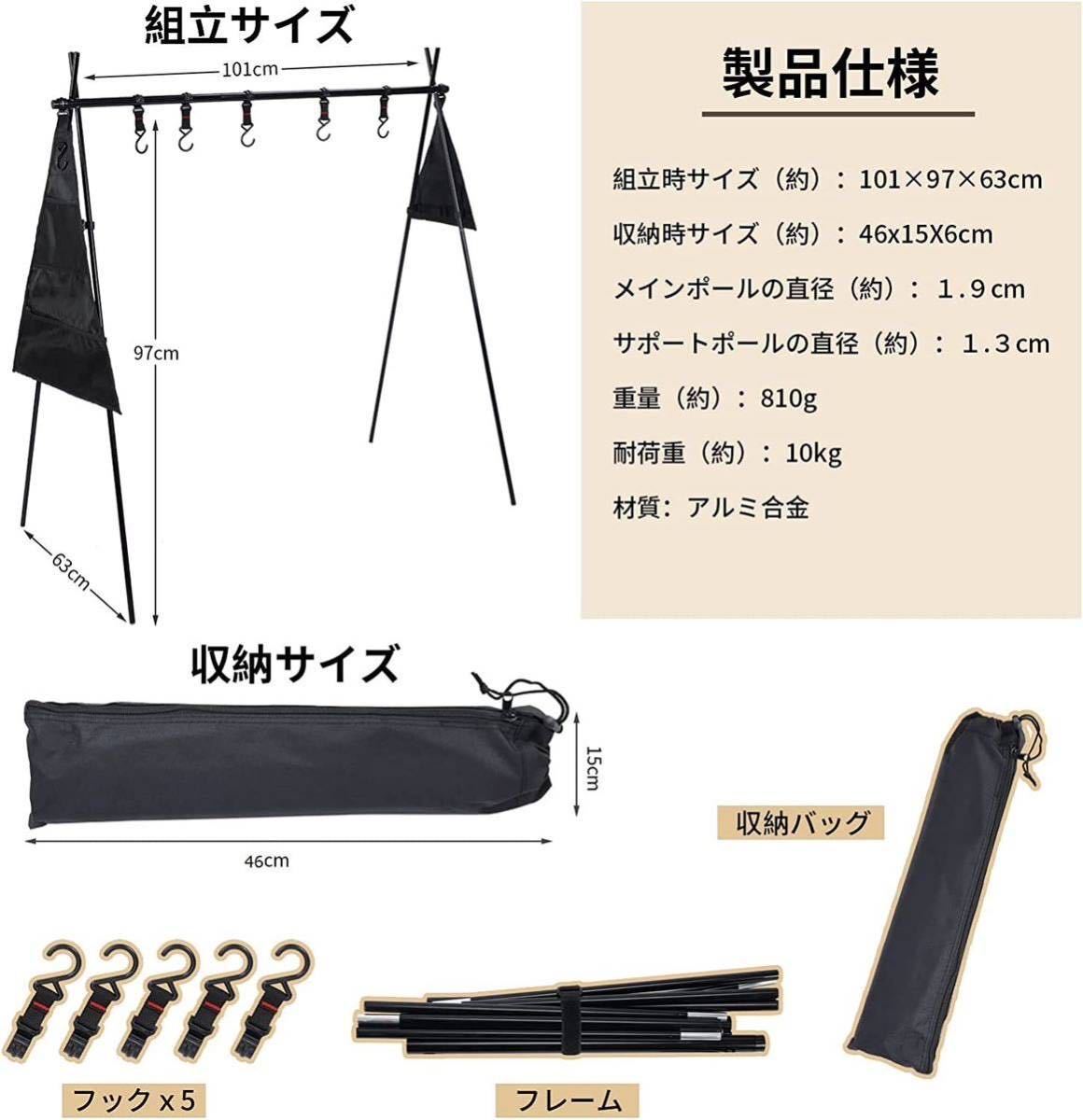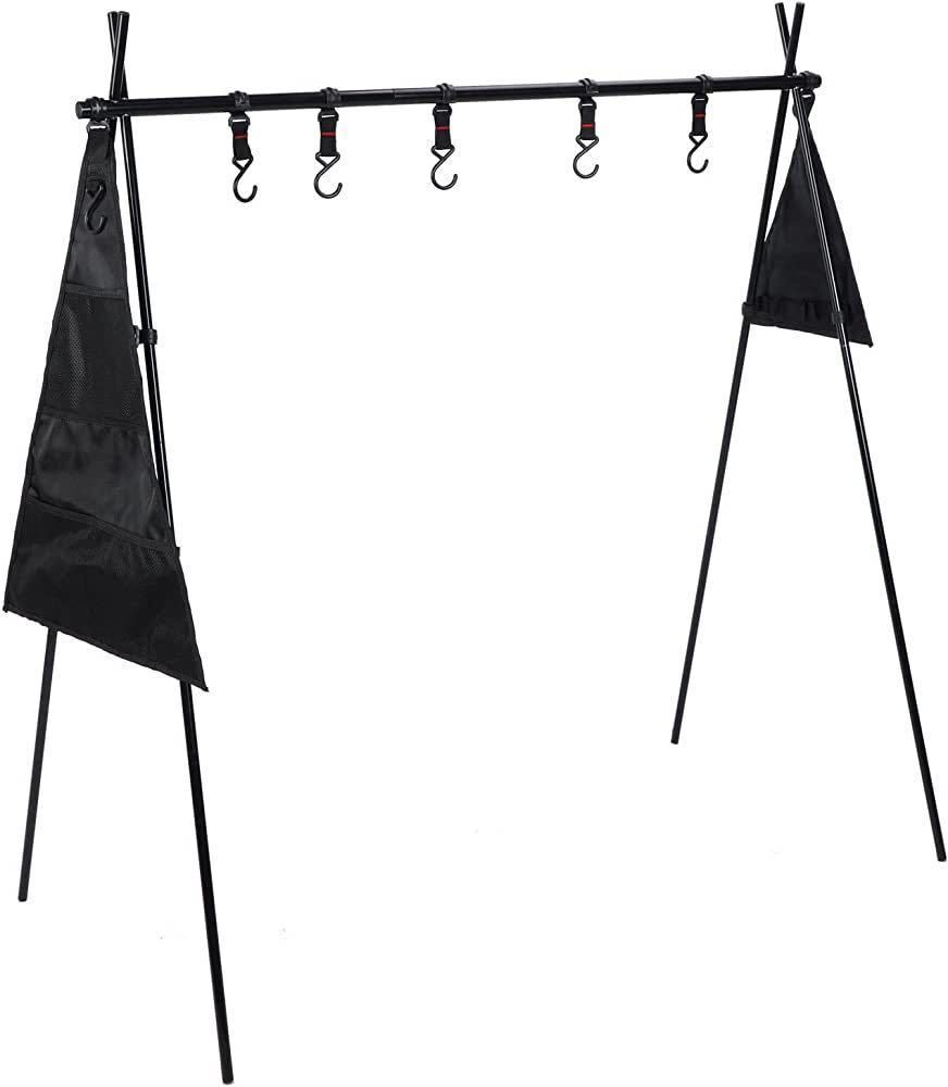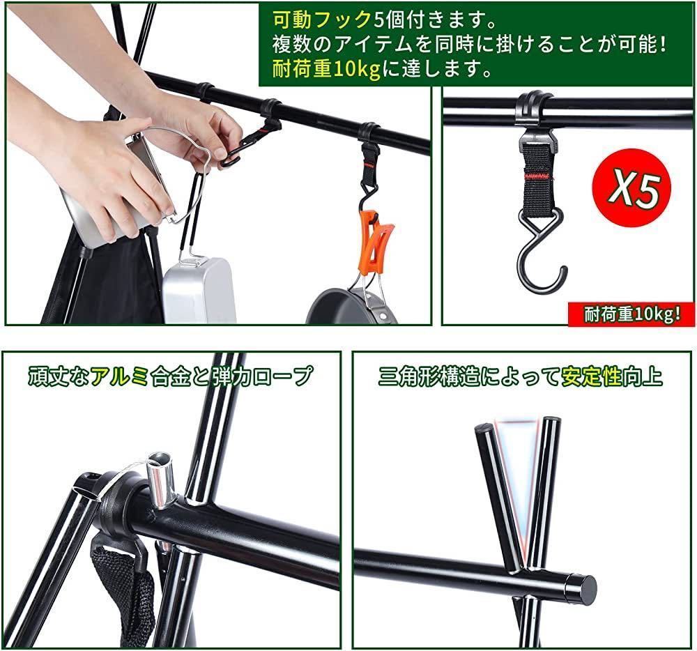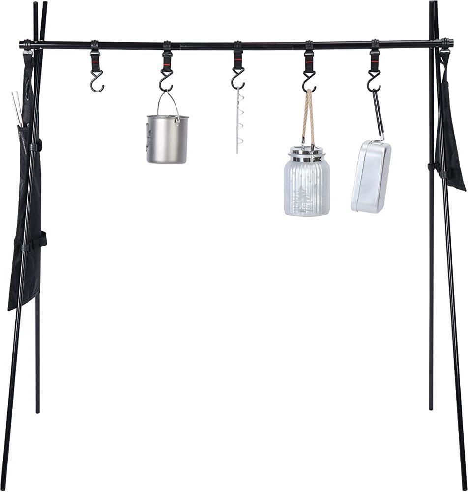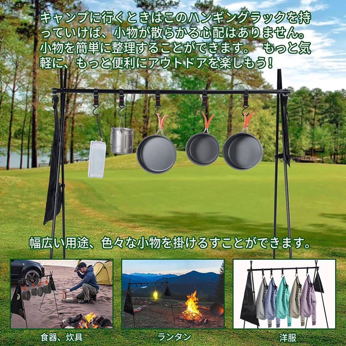 ハンギングラック ランタンスタンド キャンプハンガーラック 道具整理用ハンガー 5つ可動フック付き 三角ハンギング収納袋付き キャンプ道具 物干し 折り畳み式 組み立て簡単 超軽量 収納便利 耐久性 洋服掛け可能 アウトドア キャンプ 公園 BBQ