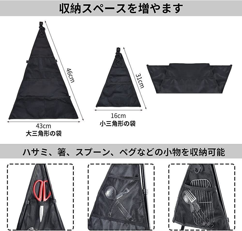 【商品仕様】材質:アルミ合金。サイズ:約101×97×63cm(展開)約48×13×3cm(収納) 重量:約810g プラスチックラック×5 三角形収納袋(大):44×46cm 三角形収納袋(小):16×31cm