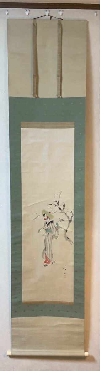 ・東京美術倶楽部(東美鑑定評価機構)の鑑定書つきの美人画の真作。共箱記載のタイトル名「鳥追」の出品になります。手描き掛軸作品です。