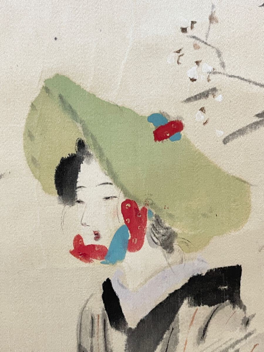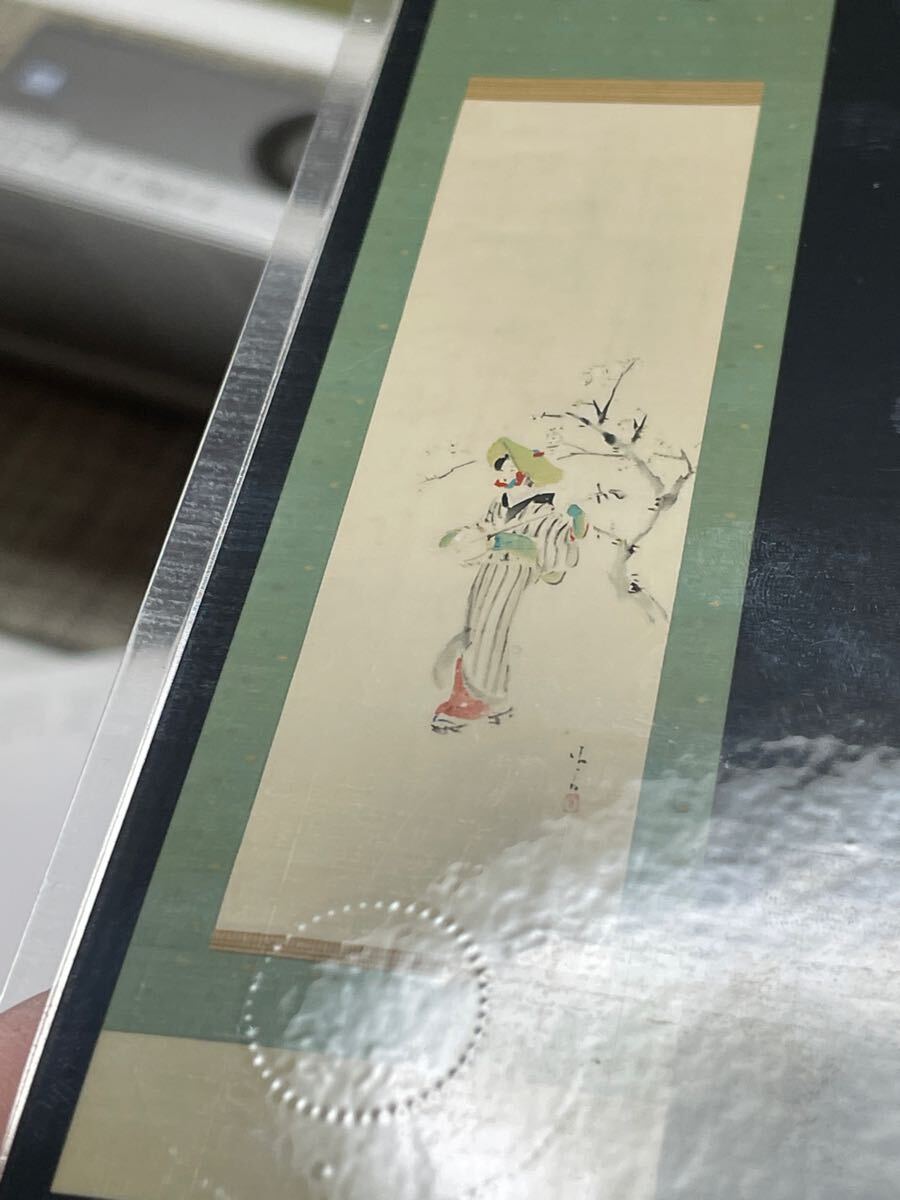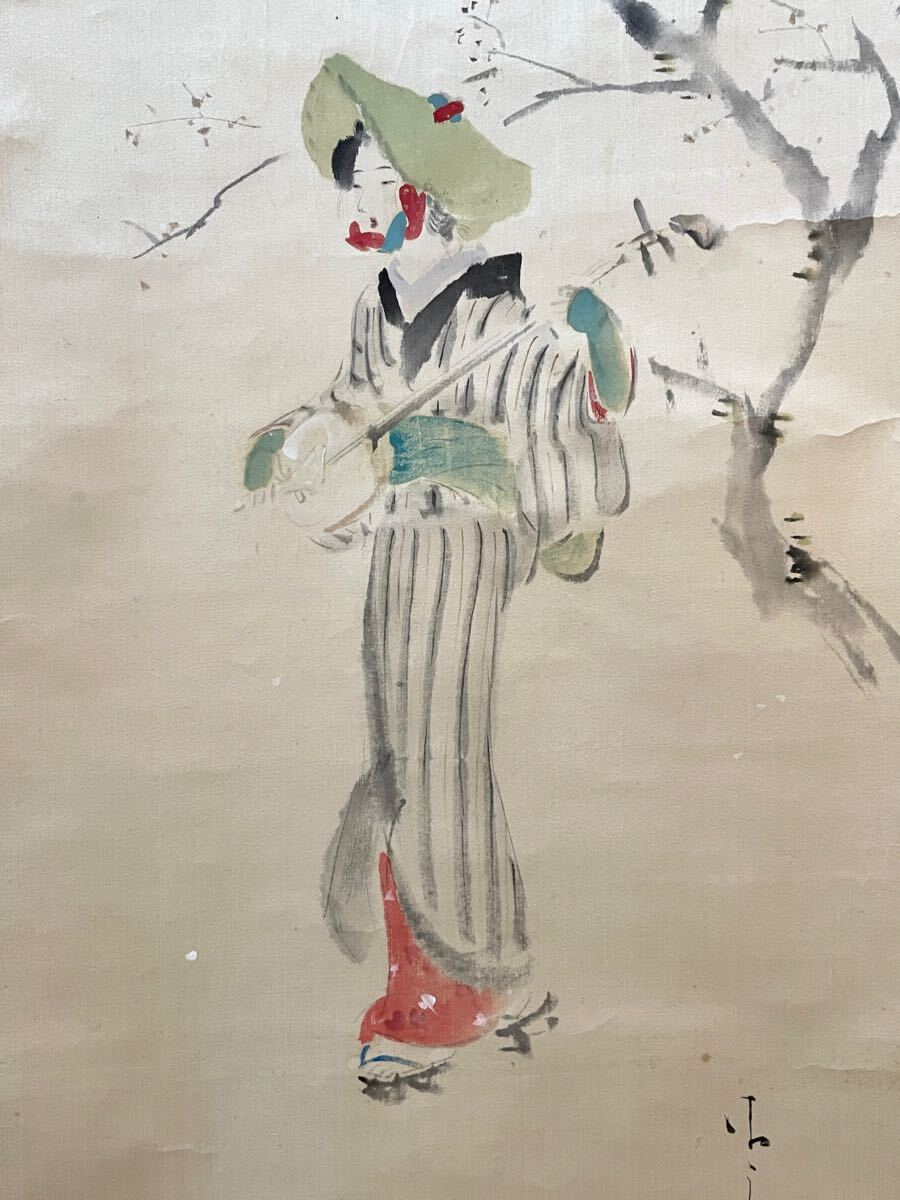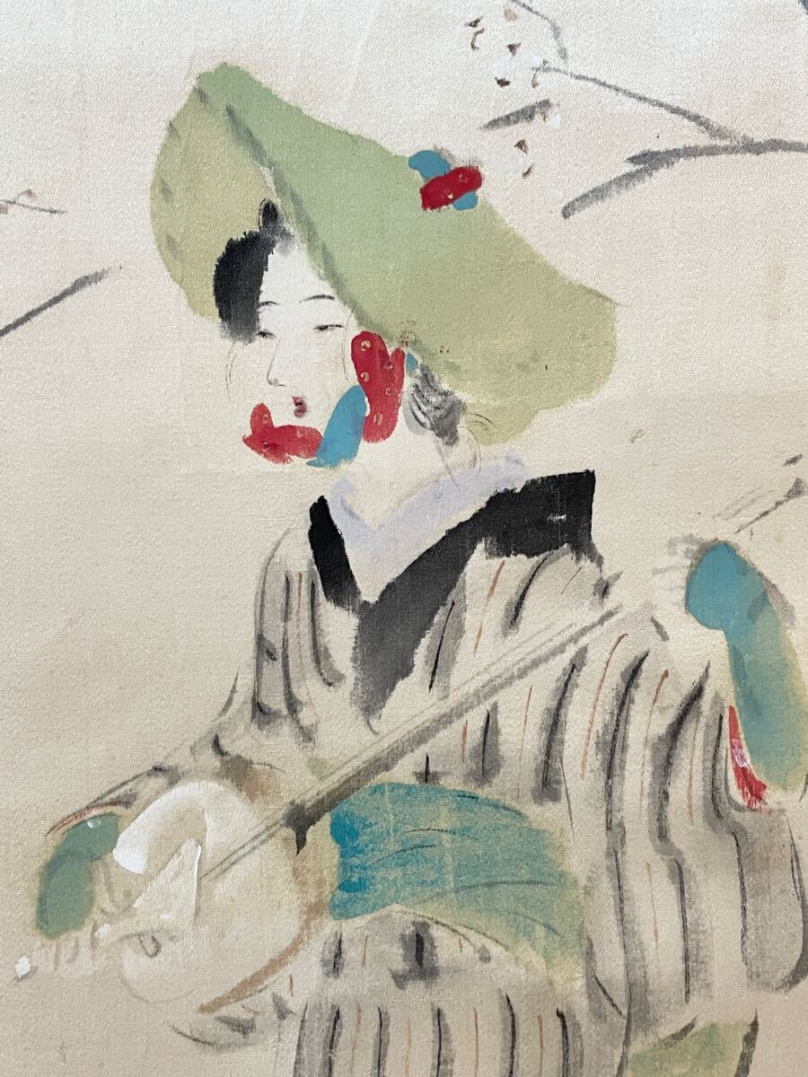・共箱にあるタイトルは「鳥追」。梅の木の下で三味線を弾き鳥追い唄を歌う美人。実に見事な描きぶり。美人の顔(特に極小の目や口元の表情)の絶妙な超絶技巧の超繊細な描写、流麗でこなれた線描、洗練されたぼかし具合の絶妙な彩色具合・・透明感にあふれ神がかっています・・・さすが巨匠。