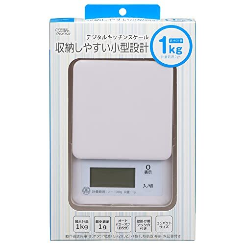 最大計量1kg。使い勝手の良い小型キッチンスケール♪最大計量1kg、表示単位1g フック穴付きで壁掛け収納ができます。 オートパワーオフ(電源切り忘れ防止)機能付きの省エネ設計 追加計量(「0表示」機能)付き。容器の重さを引き、材料別の追加計量が簡単にできます。 仕様 ■最大計量(ひょう量):1000g ■表示単位(目量):1g ■ 計量範囲:2~1000g ■ 安定所要時間(約):3秒 オートパワーオフ(約):5分 付属品:ボタン電池(CR2032)×1個テスト用、取扱説明書(書付)