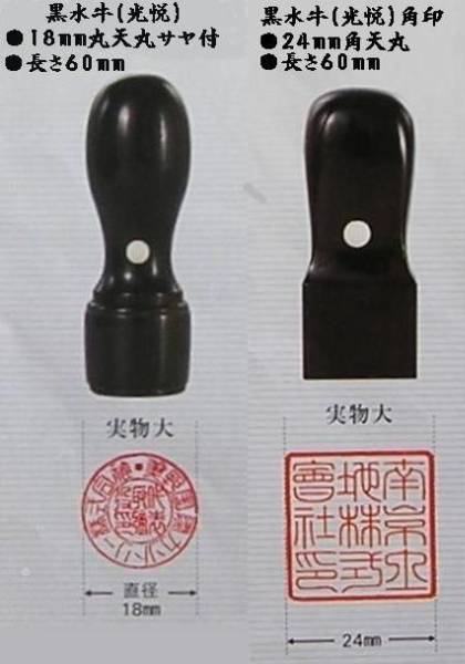 | 価格及び納期 | 黒水牛光悦 18mm天丸サヤ付(代表者印) 24mm角天丸(会社印) \23890・彫刻・別珍ケース付。 納期・7日 |