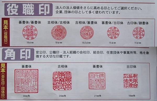 | 質問事項の内容 | ・お名前 ・ご住所 ・ご連絡先 ・彫刻の名称(代表者印・角印) ・書体 ・その他必要事項 |