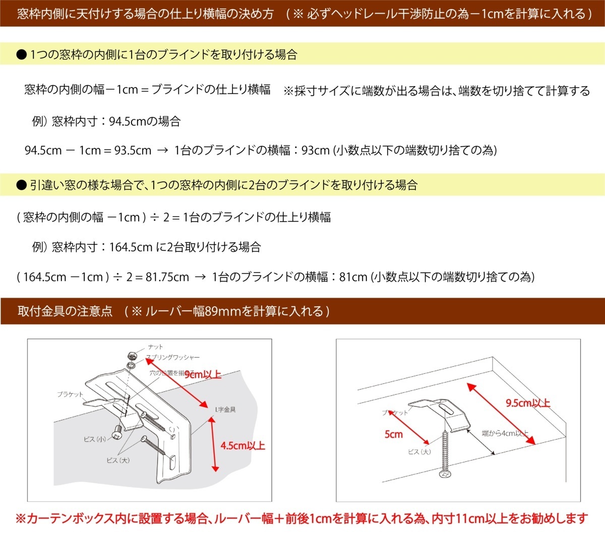 ● 構造上カーテンレールへの取付は出来ません ● ご注文順に発送しておりますで、加工無しの場合でも発送まで7日程度かかる場合がございます お急ぎの場合は必ずご質問欄よりお問合せ頂き納期をご確認下さい ● 取付場所の下地強度をご確認下さい ご不明な場合はご自宅の住宅施工会社にお問合せ下さい ● 製品幅が長い商品は事前に搬入経路をご確認下さい ● ルーバーの材質と梱包の都合上、ルーバーに「折りしわ」ができてしまいますが 不良品ではございません。その際は吊り下げた状態で1~2週間で目立たなくなります ● ルーバーはお洗濯出来ません ※汚れがついた場合は水に濡らして固く絞ったタオル等で拭いて下さい ● ご注文後のキャンセルやサイズ変更は一切お受付け出来ませんので 予め取付ヶ所のサイズ等ご確認の上ご検討下さい ※ ご不明な点やご心配な点は、お気軽にご質問欄よりお問合せ下さい ● ご注文後から製作検品工程、発送手配に入りますので、ご注文後のサイズ・カラー・数量等に つきまして変更やキャンセルが一切出来ませんのでご注意下さい ● こちらの商品はサイズをお客様のご指定で加工した商品となっております サイズのご指定や取付施工に関しましては現場の採寸調査等をお客様自身にて行って頂いて おりますのでご注文後のサイズやカラー違い等による変更・交換や、商品が予定していた 場所に取付が出来ないサイズが合わなかった等のキャンセルや返品、交換等は一切お受付け 出来ませんので予めご了承下さい ※ ご不明な点やご心配な点は、何でも結構ですのでお気軽にご質問欄よりお問合せ下さいませ ● 落札後、24時間以内にご連絡がとれる方のみご入札下さい ※24時間以内にご連絡がとれない場合は落札者様都合でのキャンセルとさせて頂きます ● 落札後、1週間以内に御入金が可能な方のみご入札下さい ※1週間以内に御入金がない場合も、落札者様都合でキャンセルとさせて頂きます ● 最近イタズラ入札が多い為ので、新規アカウントからの入札はお断りさせて頂いております ※万が一、ご入札があった場合は入札を削除致しますので何卒ご了承下さい |