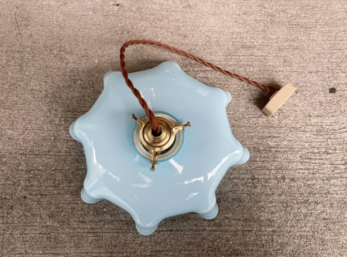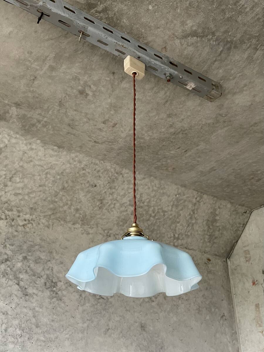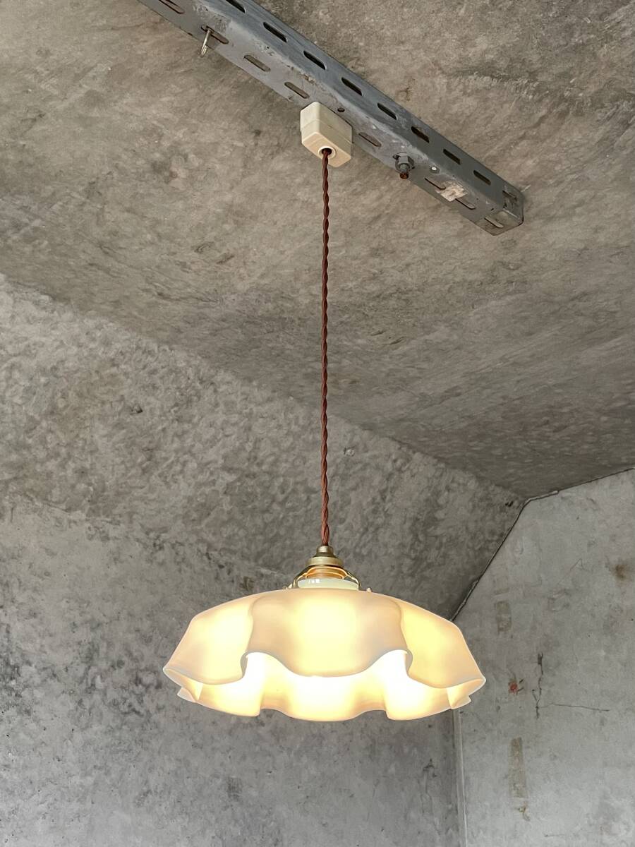 16. フランスアンティーク 古民家 ミルクガラスシェードペンダントランプ ホワイト フリル 吊り下げ シーリングライト 店舗 美容室