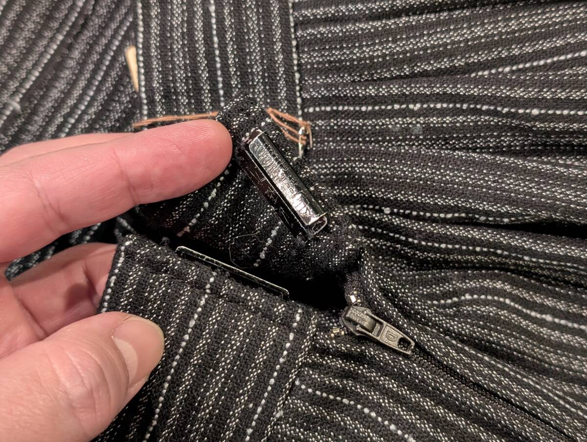 古いパンツによく見られる、ハイバックという後ろが山形にせり上がった仕様をフロントにしたようなM字のハイウエストデザインなど、マスキュリンな佇まいは唯一無二!