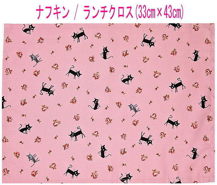 ナフキン・ランチクロス(33cm×43cm)長方形【黒猫&バラ柄 ピンク】ランチマット ランチョンマット 日本製 花 薔薇 ローズ ネコ ねこ