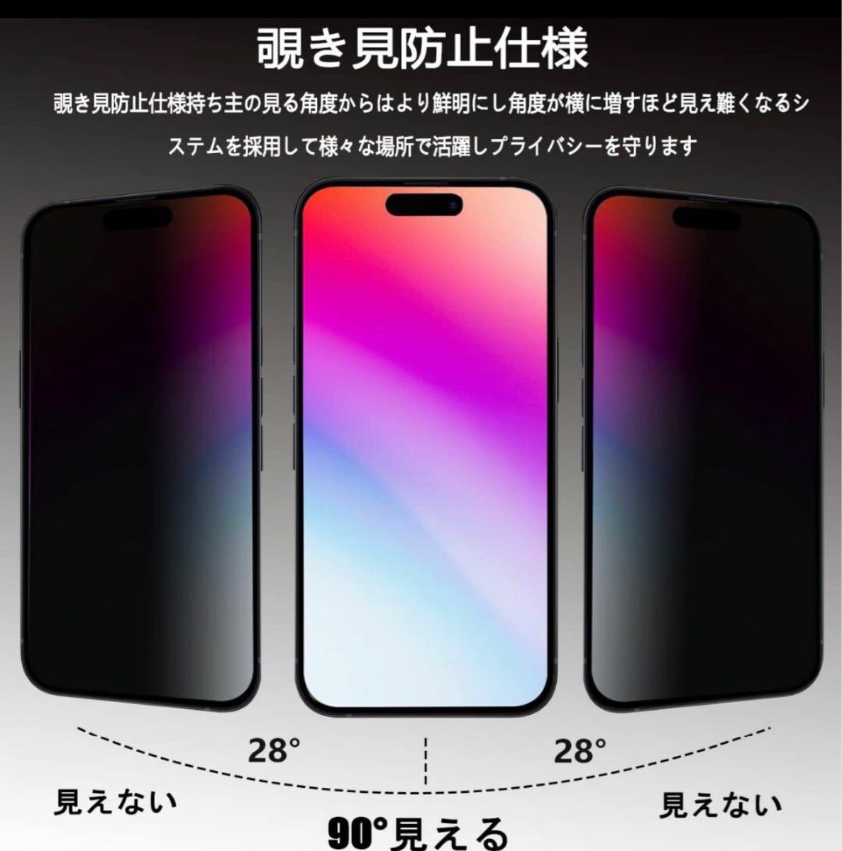 【覗き見防止】覗き見防止 ガラスフィルム 特別なブラインド加工により、真正面から見ると高透過率ではっきり見えますが、画面を左右から見ると画面が段々真っ黒になります。情報漏洩を気にせず安心して使うことができ。
