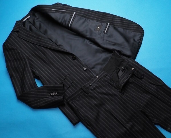 新品8.6万円 大手百貨店扱い 秋冬『MARZOTTO マルゾット 伊製生地』Super100S ウール100% フランネル ストライプ スーツA4黒(A) 1164461
