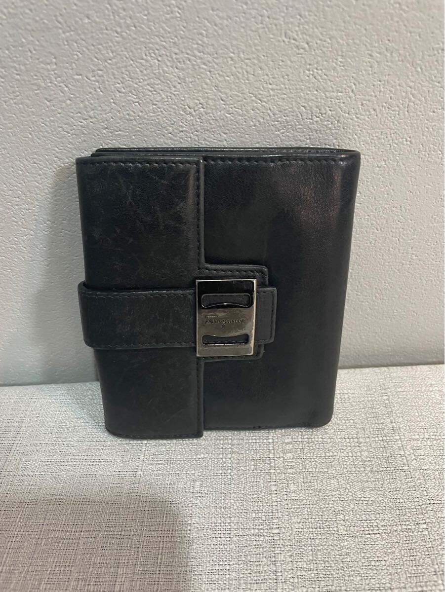 フェラガモFerragamo2つ折り財布小銭入れ開閉ボタン黒本革レザーレディースロゴ