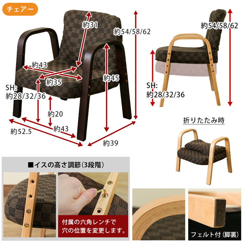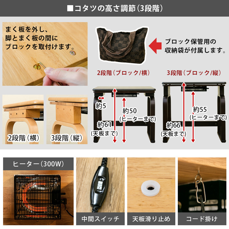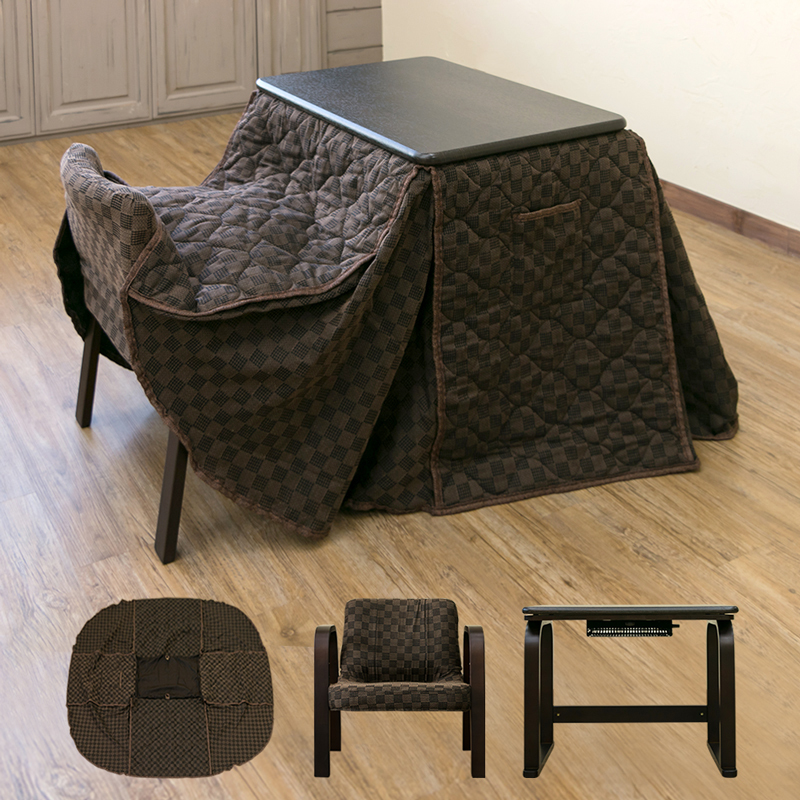 | サイズ | コタツ:(W)幅70×(D)奥行50×(H)高さ56/61/66cm(3段階) 天板厚:約25mm チェア:(W)幅52.5×(D)奥行39×(H)高さ28/32/36cm(3段階) |