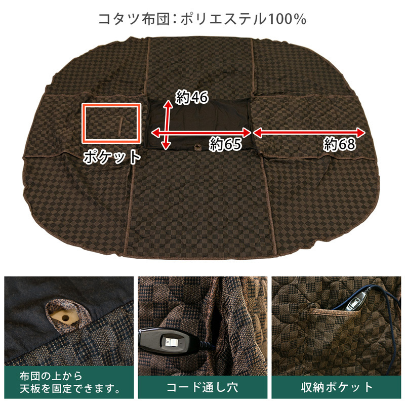 | 材質 | コタツ天板:合成樹脂化粧繊維板(PVCシート)/フラッシュ構造(芯材ハニカム使用) 脚:ラバーウッド(PU塗装) ヒーター:300W U字型石英管ヒーター(コード約3m・中間スイッチ) チェア内材:ウレタンフォーム 肘:天然木ラバーウッド(PU塗装)、 チェア座面/布団:ポリエステル100% |