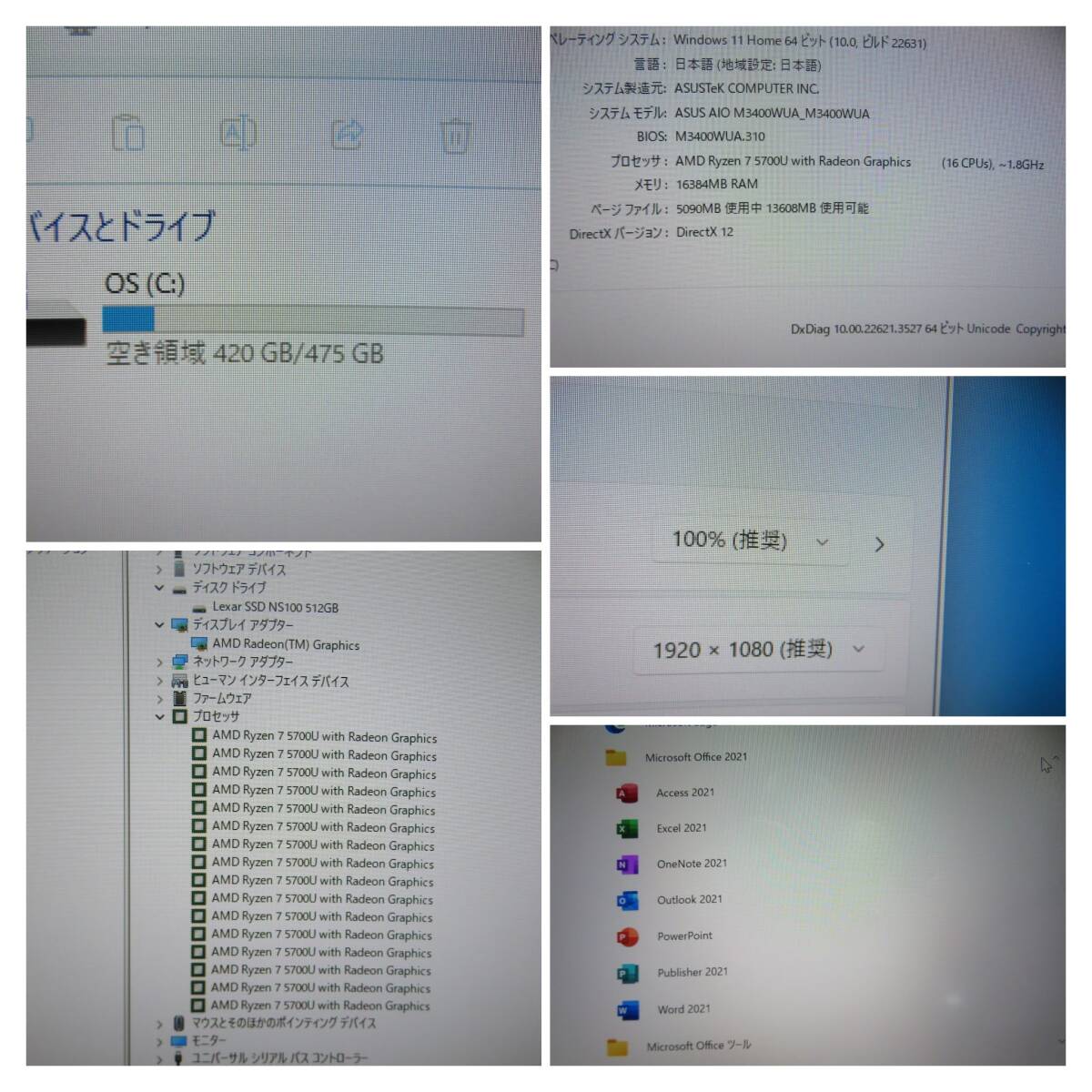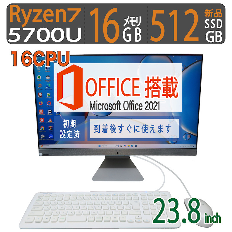 【2022年モデル・神速16CPU】◆ASUS M3400WU/ 23.8型◆高速16CPU Ryzen 7 5700U/高速新品SSD 512GB/メモリ16GB◆Windows 11/ms Office