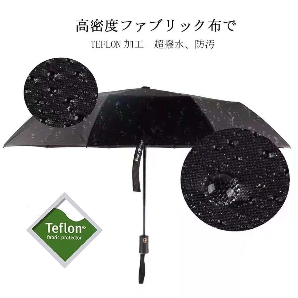 【超撥水性の折りたたみ傘】高密度生地210Tポリエステルを採用し、普通の折り畳み傘より撥水性があり、豪雨の中でも、体が濡れることはありません。折りたたみ傘に超撥水のテフロン加工を施すので傘を閉じた後、軽く振るだけで、水滴が簡単に振り払えます。電車に乗ったり、傘立てがない場所では非常に便利です。